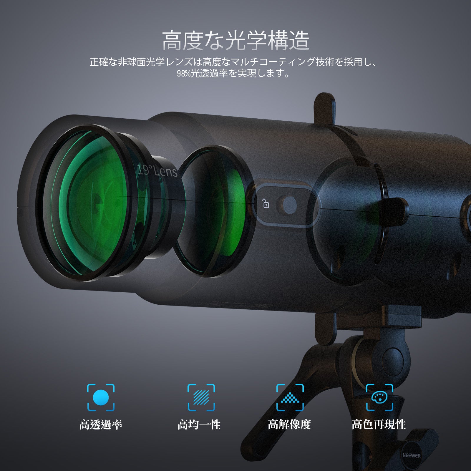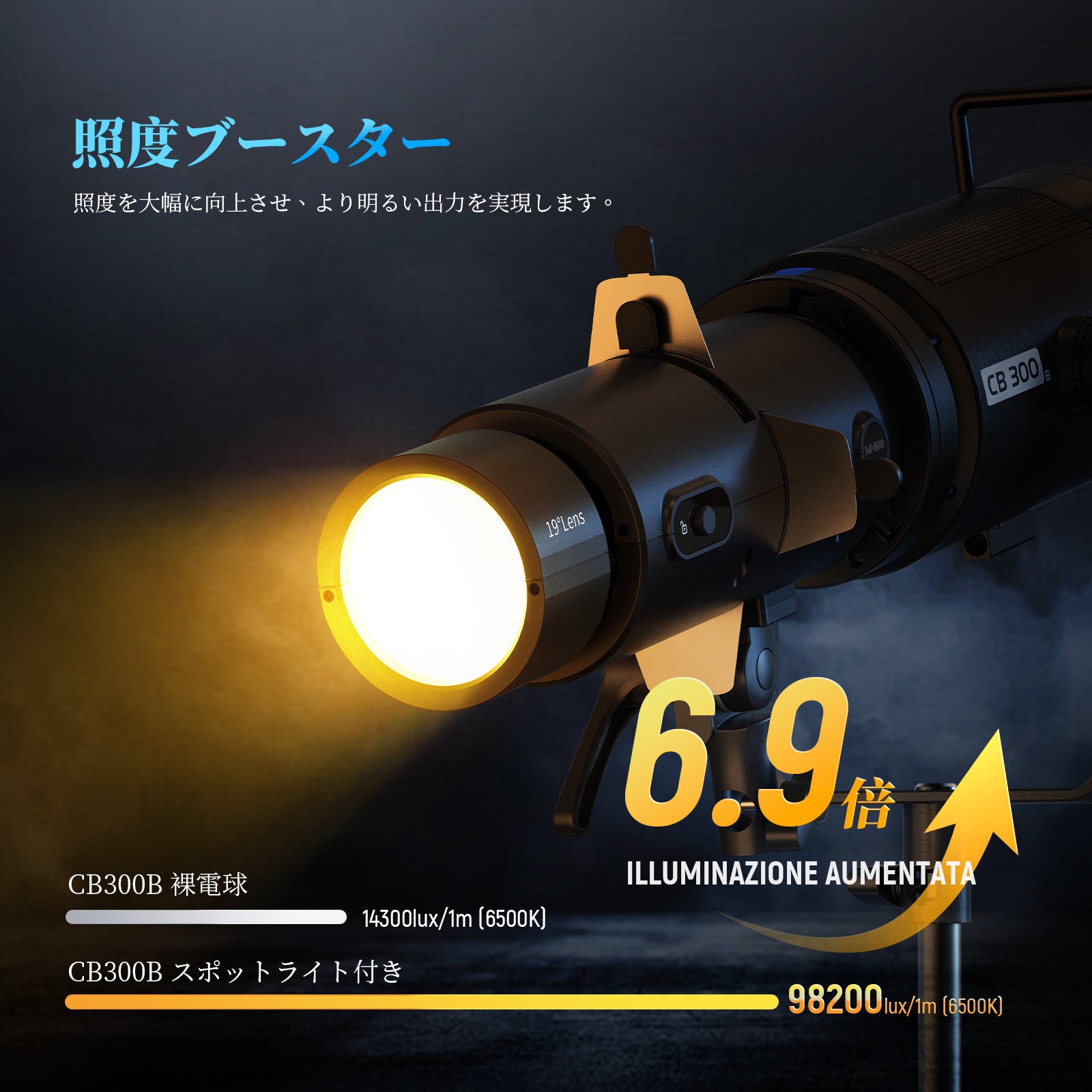 - 【高度な光学スポットライトスヌート】スポットライトは優れた光学非球面レンズと高度なマルチコーティング技術を採用し、98%光透過率を実現し、明るさと集光効率を高めます。19°投射レンズを搭載し、均一な明るさとシャープなエッジを備えたクリアな光スポットを投射します。NEEWER CB300Bと組み合わせると、1mの距離で照度が6.9倍に向上します。