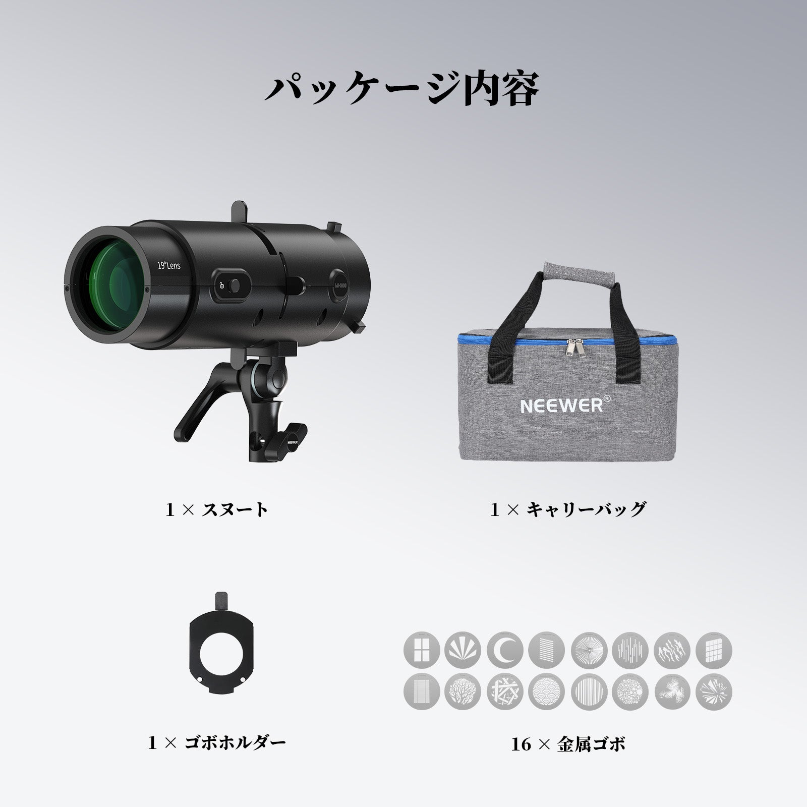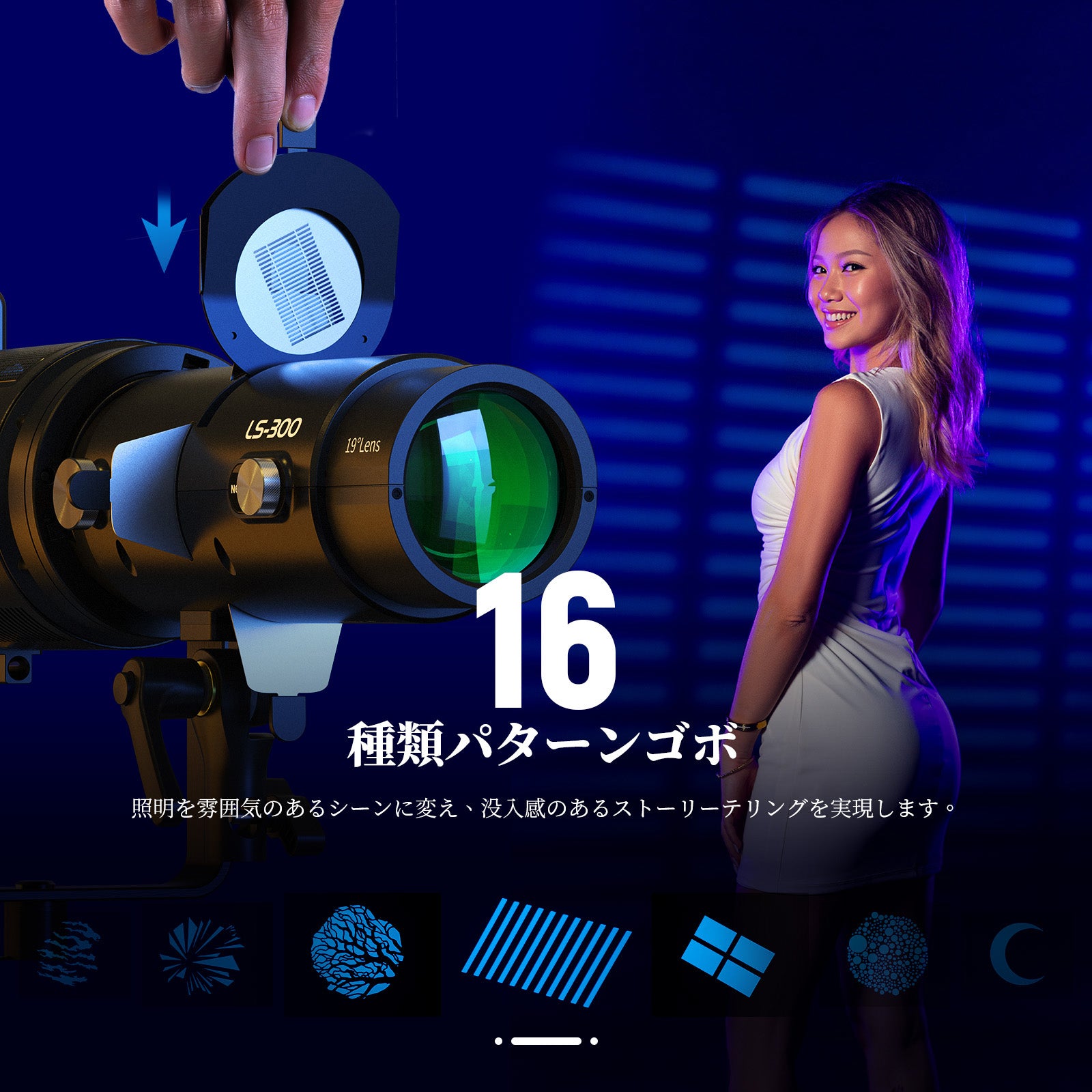 主な特徴: 19°投影レンズ/16個ゴボ