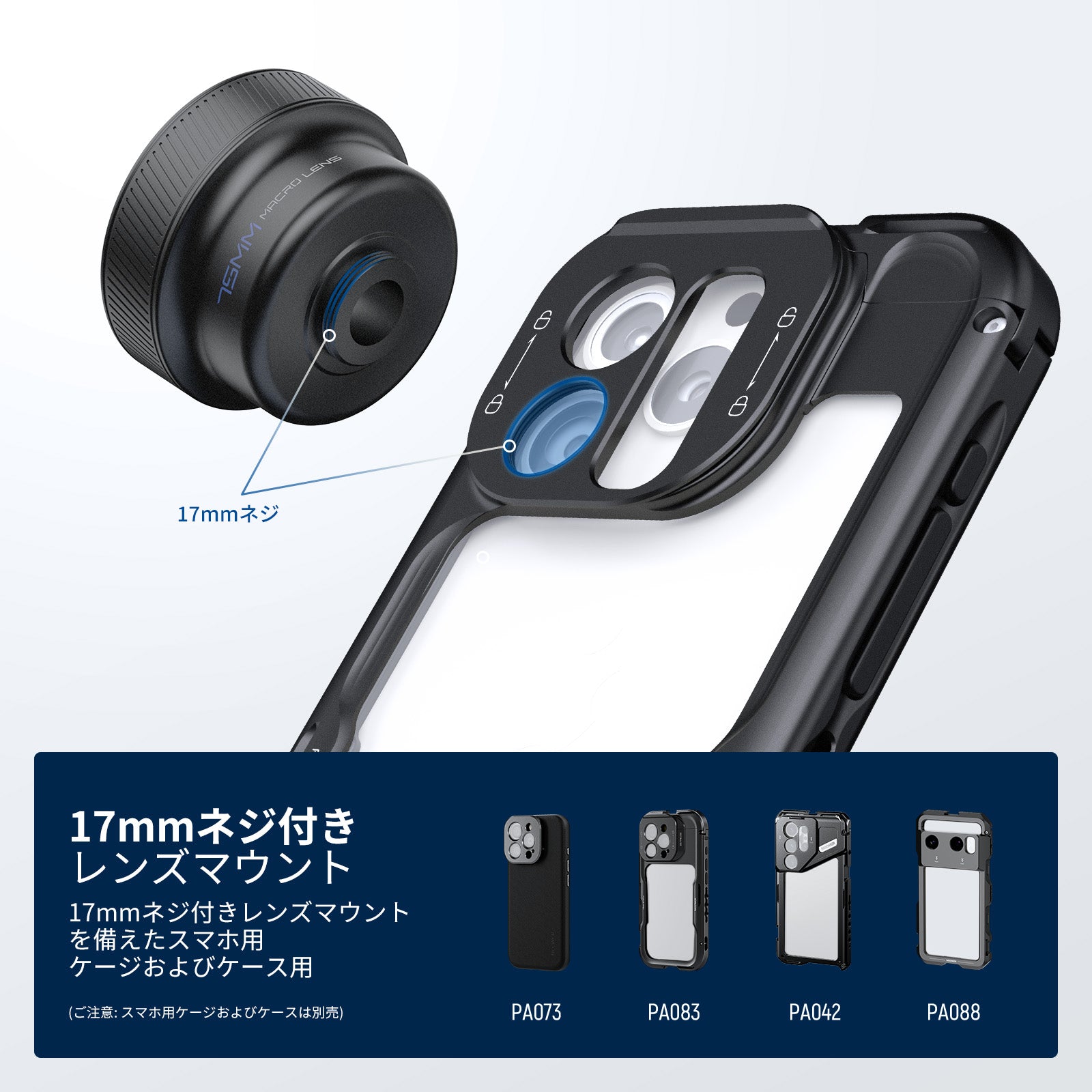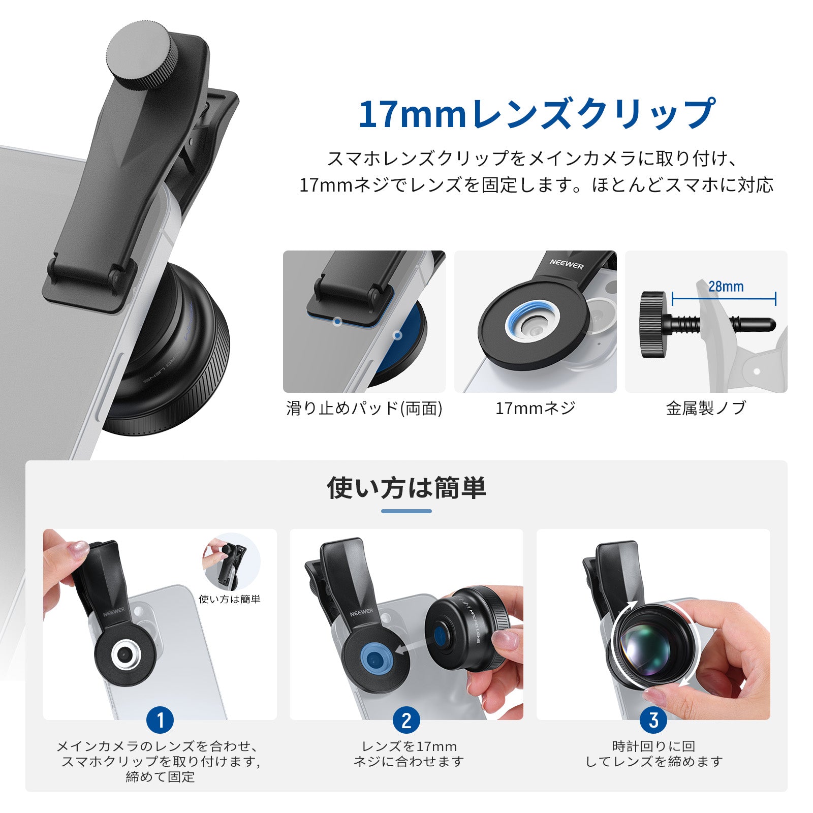 - 【17mmネジ付きレンズクリップ】 スマホレンズクリップをメインカメラに取り付けられ、17mmネジでレンズを固定します。 28mm調整可能な開口部を備、コンパチブル iPhone 17 Pro/Pro Max 、16 Pro/Pro Max、15、14、13 Pro Max、Android、Galaxy S25 Ultra。NEEWER 17mmネジ付きスマホケージ、スマホケース、バックプレートにも適合します。