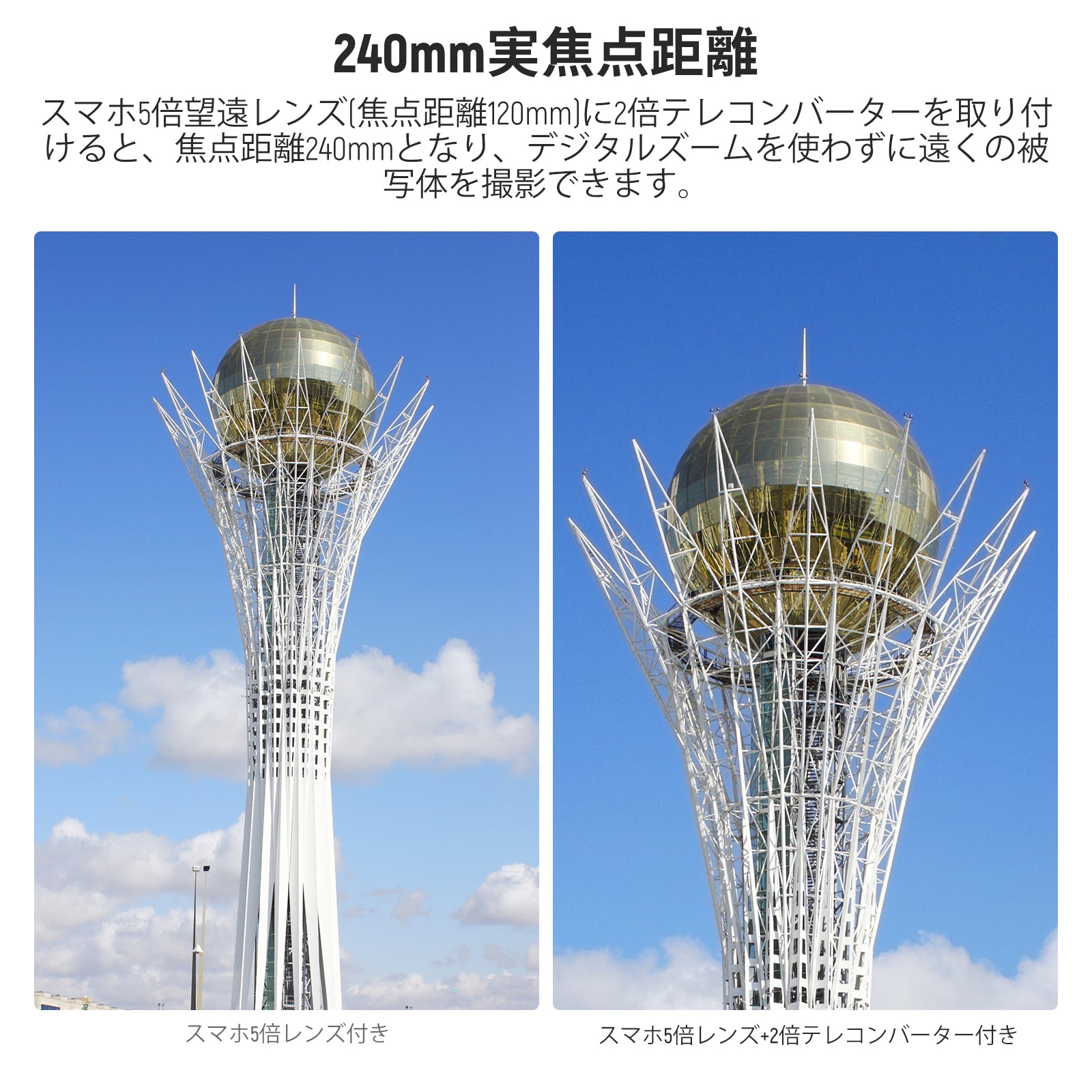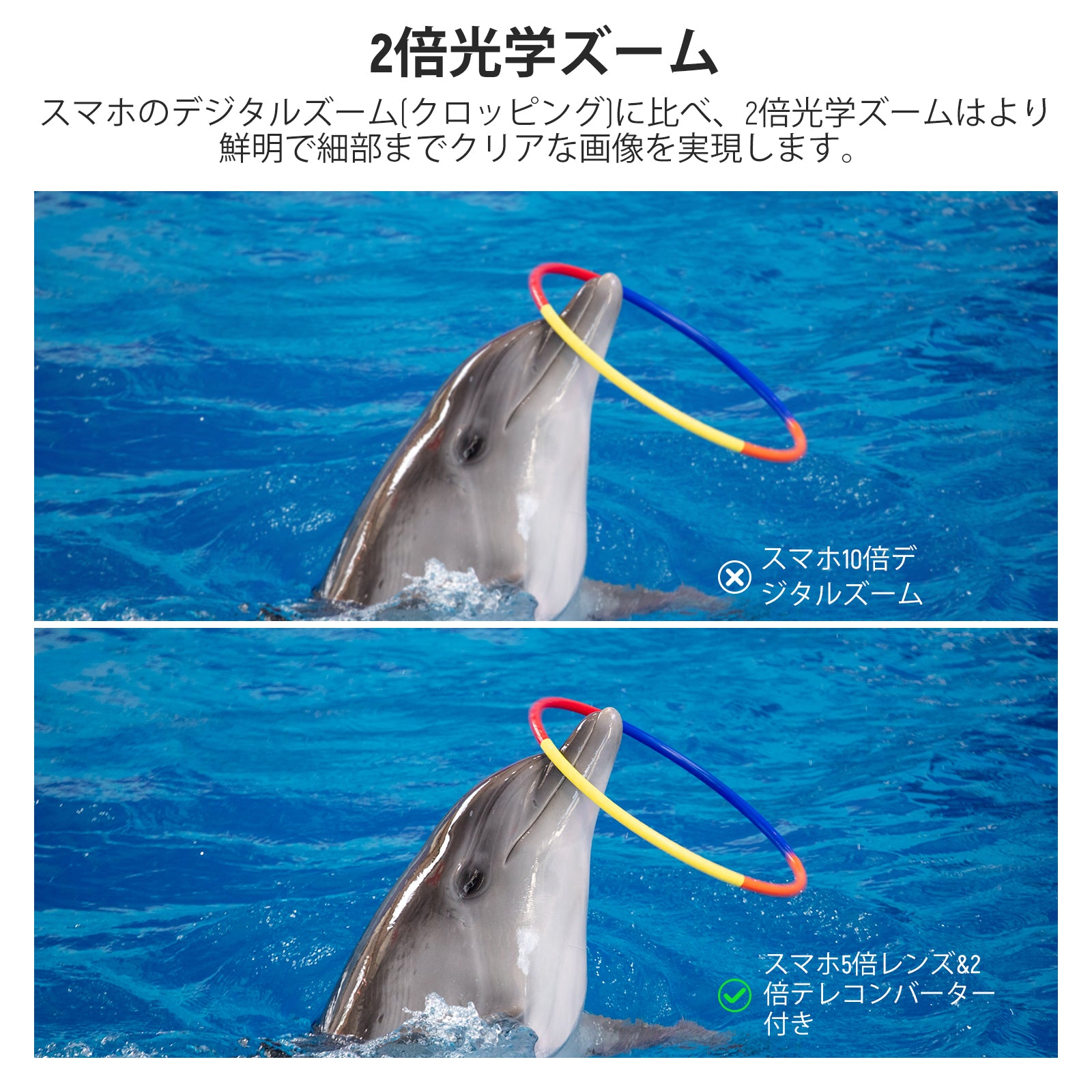 - 【2倍望遠レンズコンバーター】コンバーターは5倍望遠カメラを搭載し、スマホ向けに設計され、光学ズームを2倍にし、5倍(120mm判換算)レンズを強力な10倍(240mm判換算)ズームに変換できます。デジタルクロップや画像ロスなしで遠距離撮影が可能です。