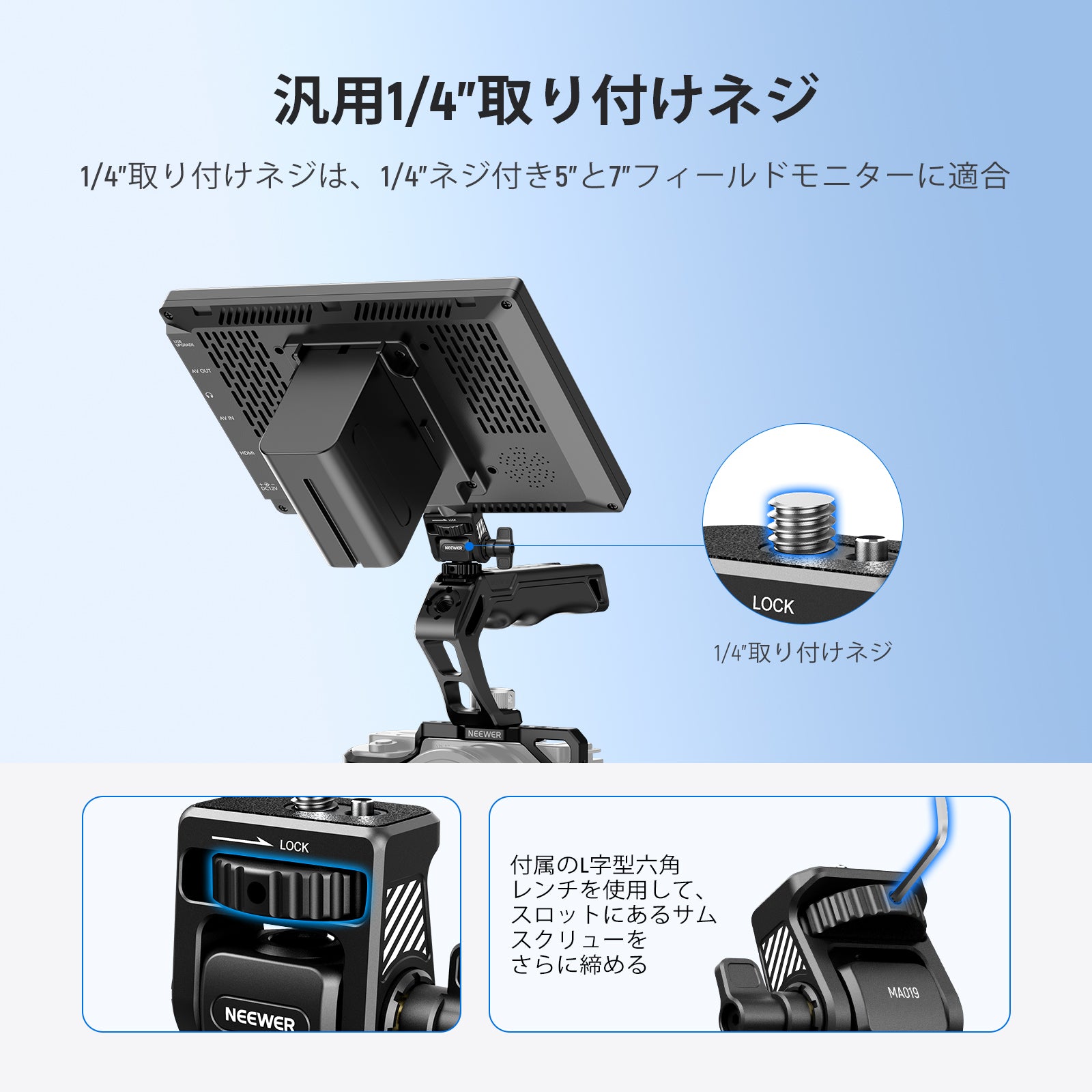 - 【汎用1/4"取り付けネジ】1/4"取り付けネジは、1/4"ネジ付き5"&7"フィールドモニターに適合します。ネジを締めるには、サムホイールを手で締めるか、付属の六角レンチを使用してさらに安全にします。