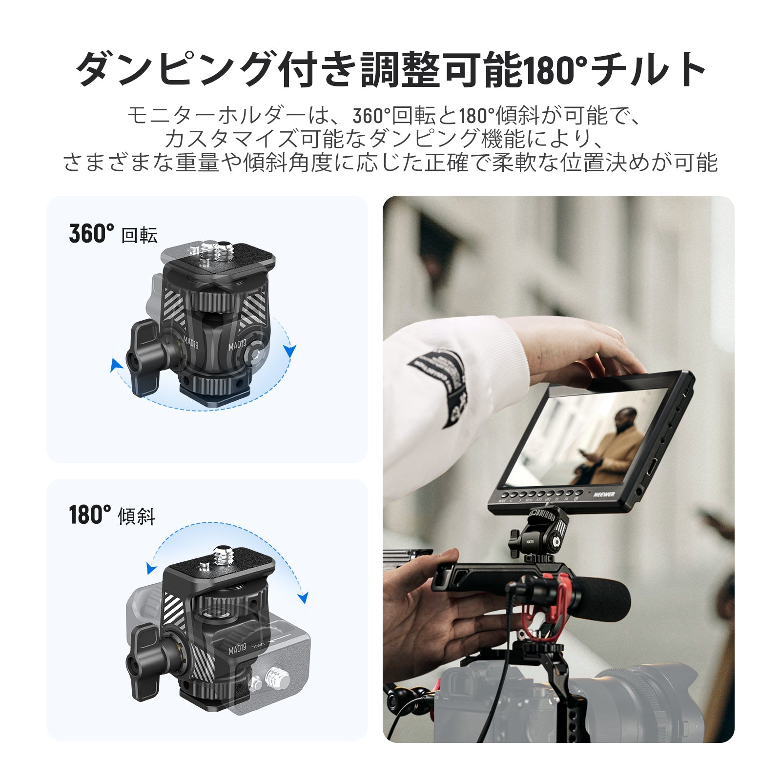 - 【調整可能な360°回転&180°チルト】フィールドモニターホルダーは、360°回転と180°チルトを提供し、調整可能な減衰を備え、異なる重量と傾斜角度に基づいて正確かつ柔軟な位置決めが可能です。サイドノブにより、手で簡単に調整できます。