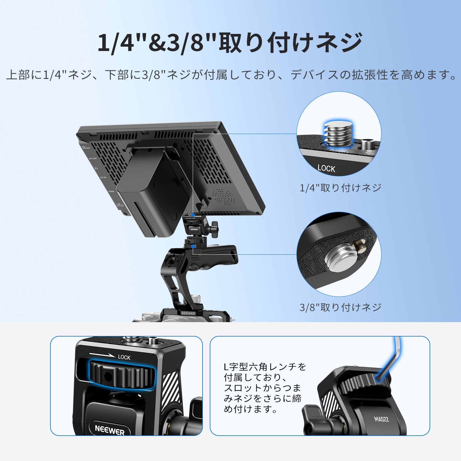 • 【1/4"&3/8"取り付けネジ】DSLRモニターは、上部に1/4"ネジを備え、5インチと7インチカメラフィールドモニターを取り付けられ、下部に3/8"ネジを搭載し、カメラケージに対応しており、カメラ、ビデオリグ、トップハンドル、サイドハンドル、ジンバルスリングハンドル、カメラホットシューにも対応しており、Vlog、映画制作、プロ仕様ビデオ、写真撮影など、コンテンツクリエイターにとって必要なアクセサリーとして、インフルエンサーにとって必要なギアとしても最適です。