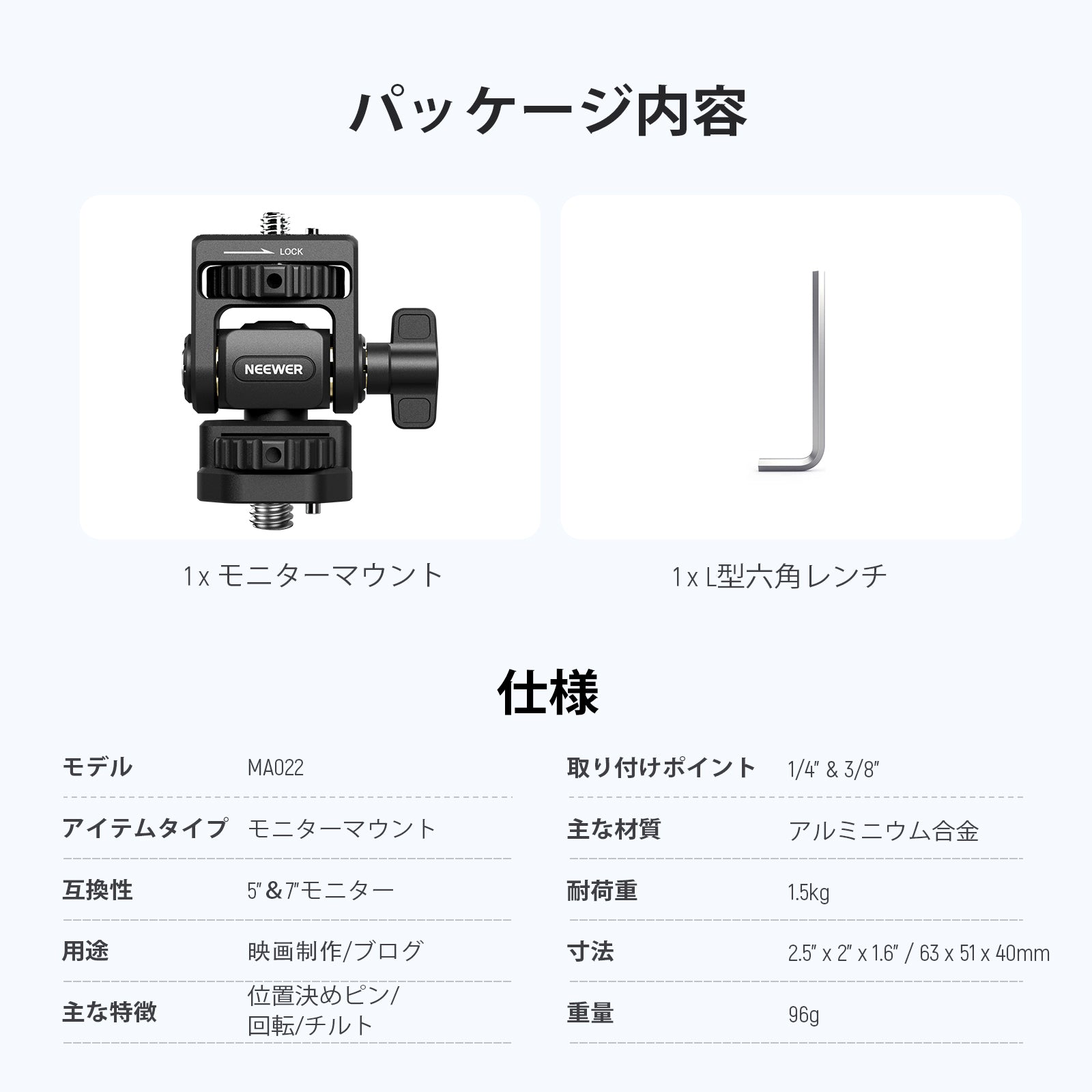 • 【コンパクト&軽量】カメラモニターブラケットはアルミ合金で作られ、頑丈ながら1.5kg高耐荷重を誇ります。重さはわずか96gと軽量で持ち運びやすく、撮影中の負担を効果的に軽減します。