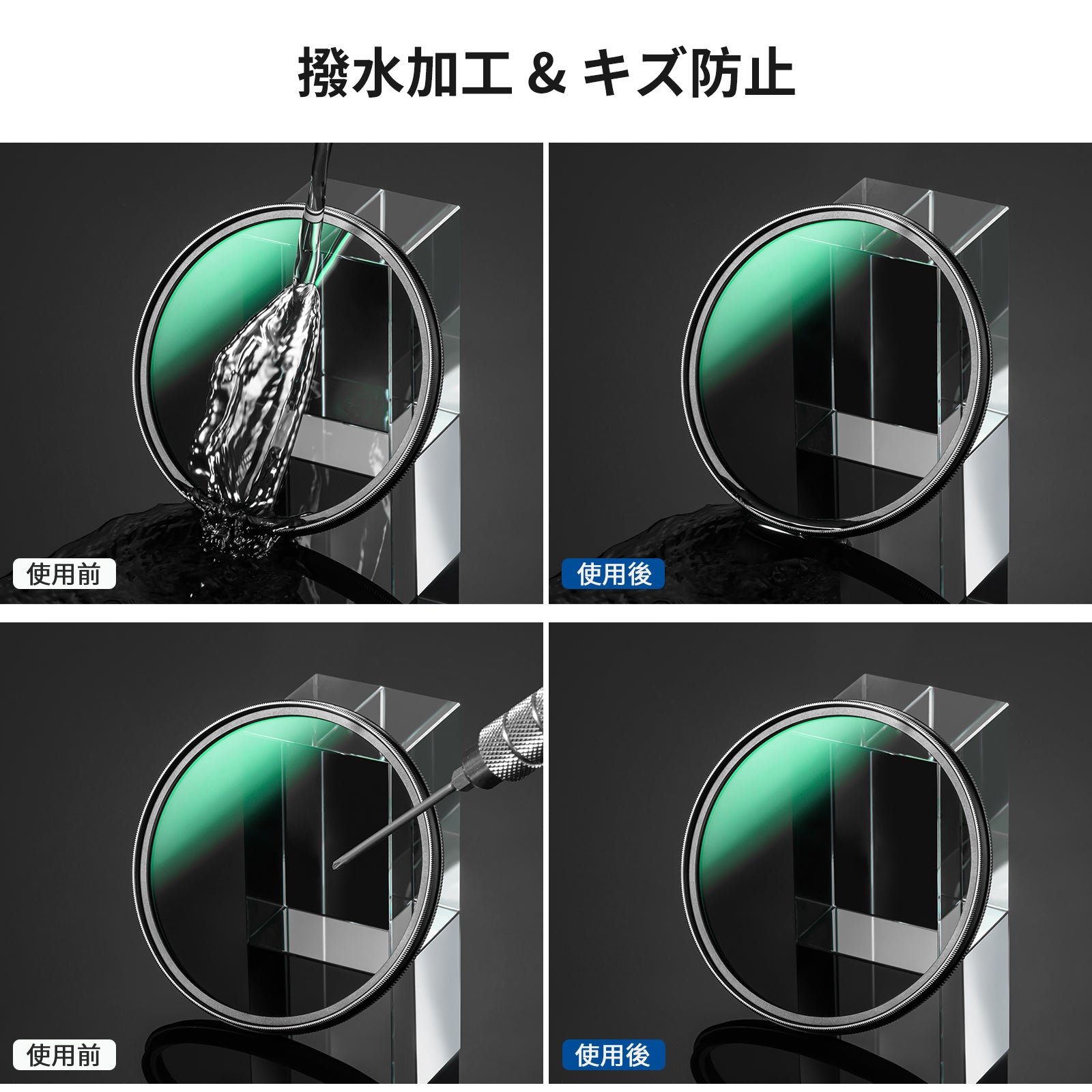 - 【多層耐性ナノコーティング】フィルターの両面に施された多層ナノコーティングは、効果的に防水、防塵、耐油、指紋防止、傷防止、一度拭くだけで簡単にお手入れできます。