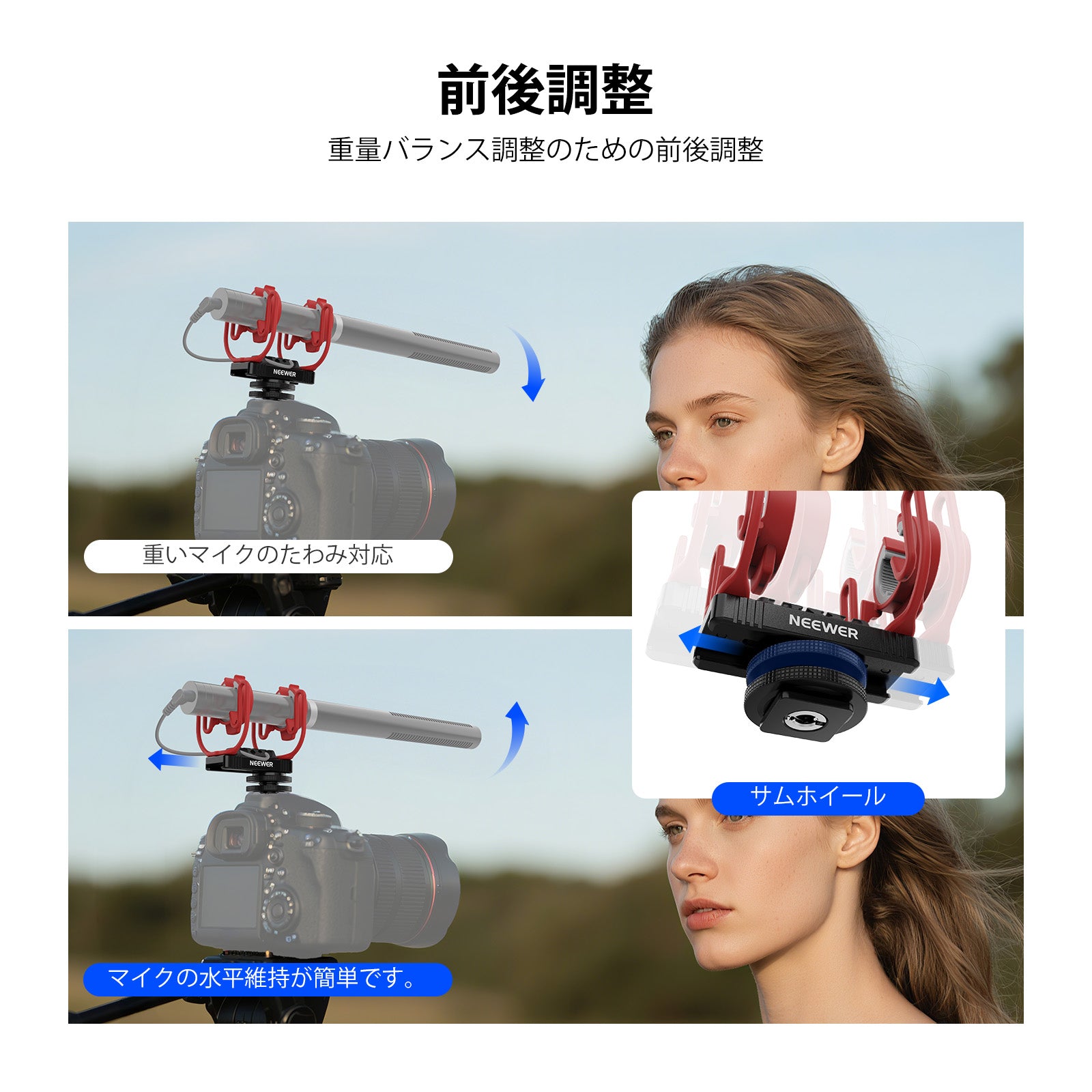 - 【汎用コールドシュー&1/4"ネジ】コールドシューマウントと1/4"ネジは、カメラ、リグ、ブームポール、三脚などに接続でき、前後に位置を調整することで重量バランスを調整可能です。