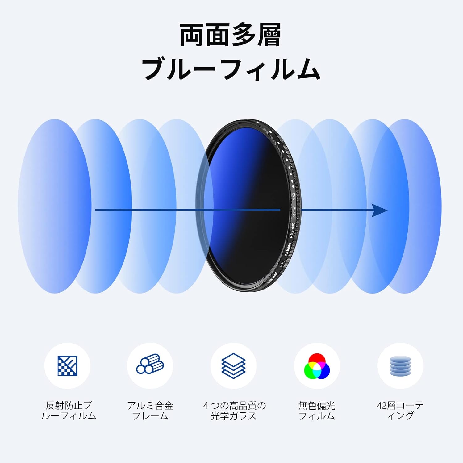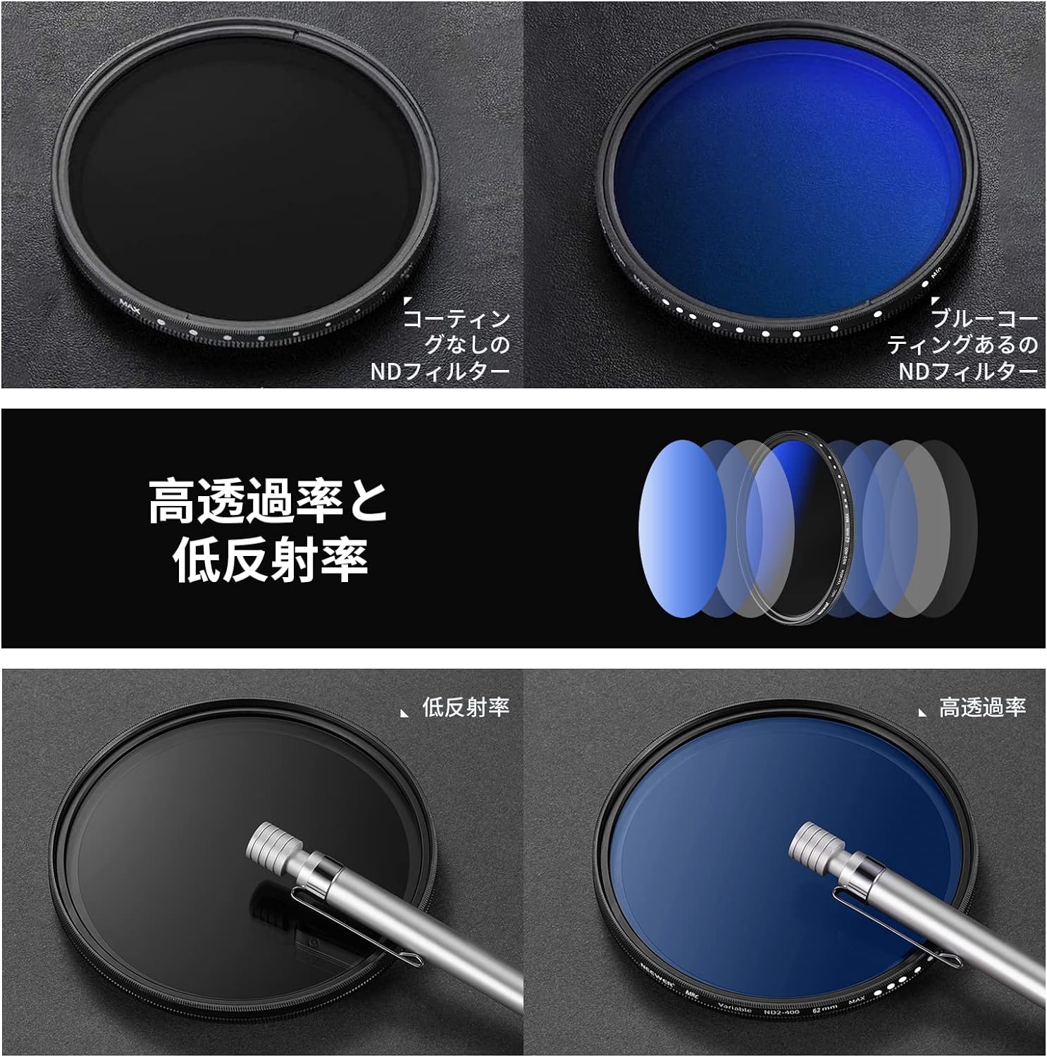 【複数ナノコーティング】最小光反射率0.1%の42ナノコーティングは、300nmから380nmの紫外線を遮断し、フレアとゴーストを低減します。マルチ耐性コーティングは、フィルターを湿気、油、ほこり、引っかき傷から保護します。
