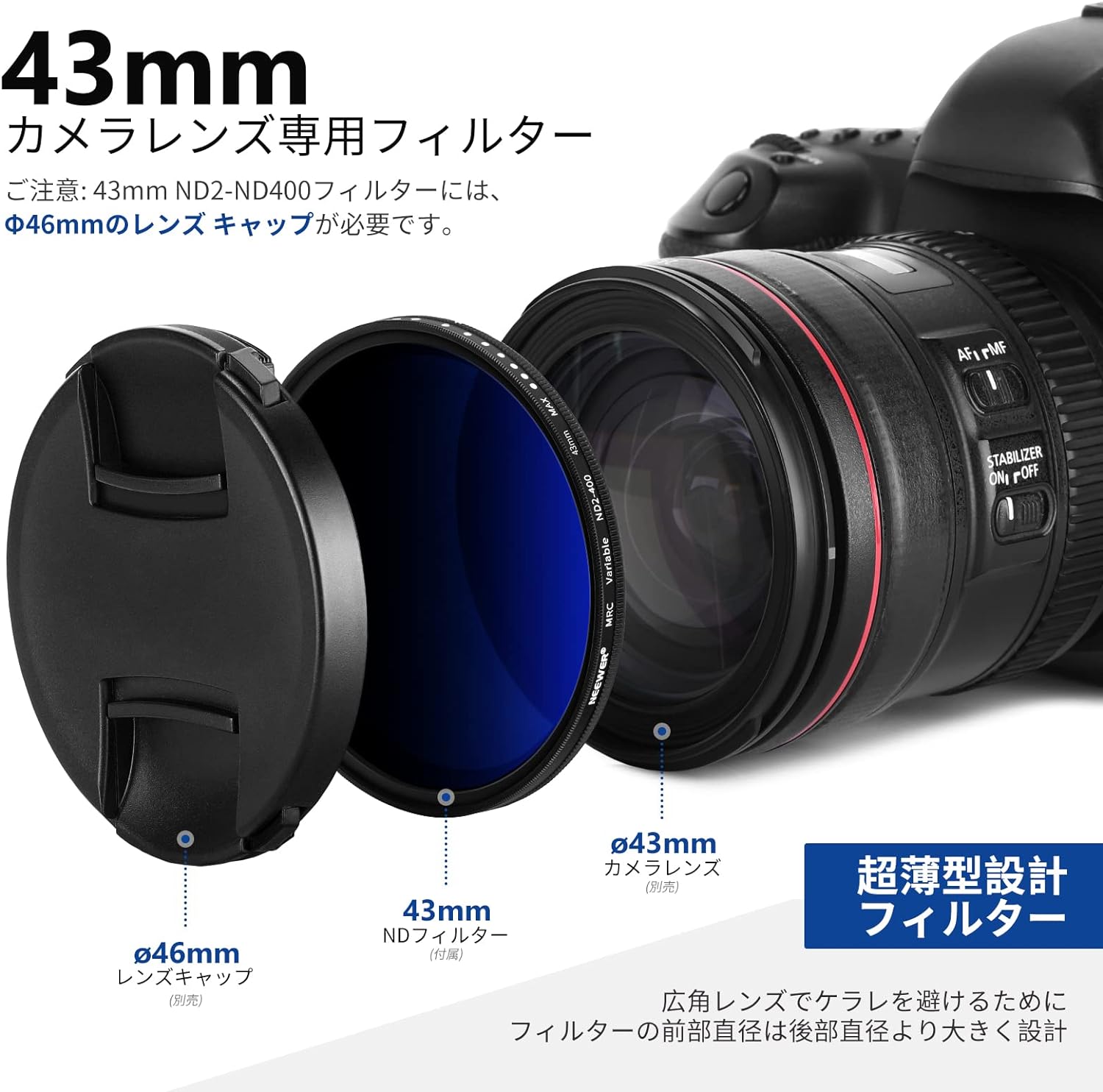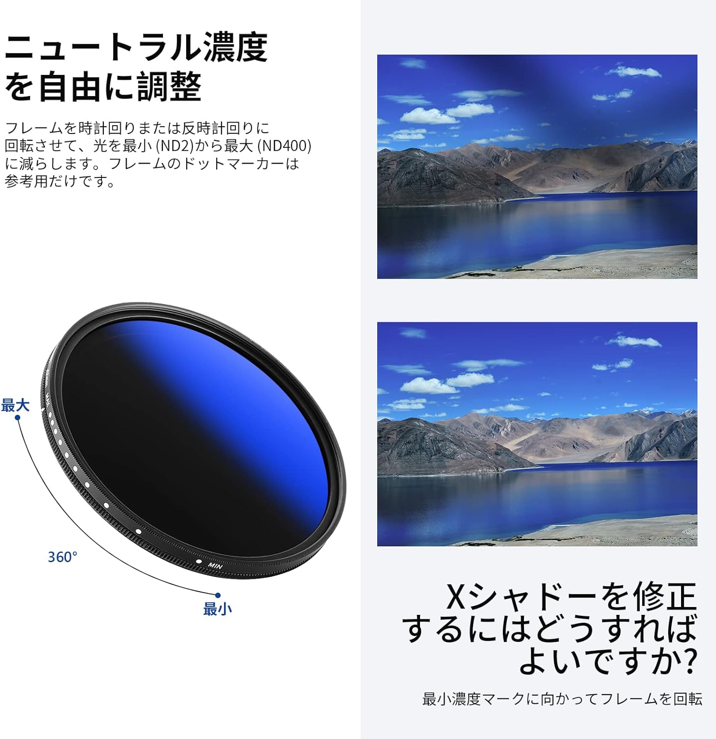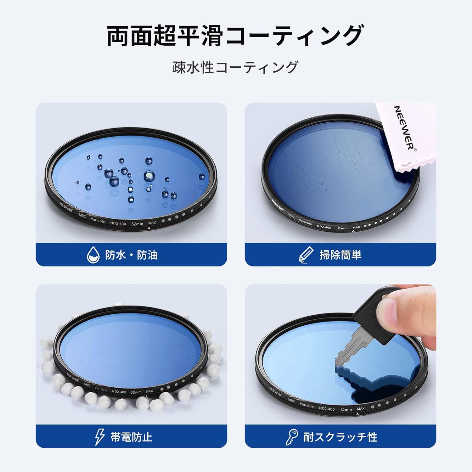 【可変NDフィルター】NEEWER ND2–ND400可変フィルターは、カメラセンサーに届く光を減らし、シャッタースピードを遅くし、絞りを大きくして撮影することを実現します。川、滝、光跡やダイナミックモーションブラー付きの動くオプジェクト撮影に最適です。
