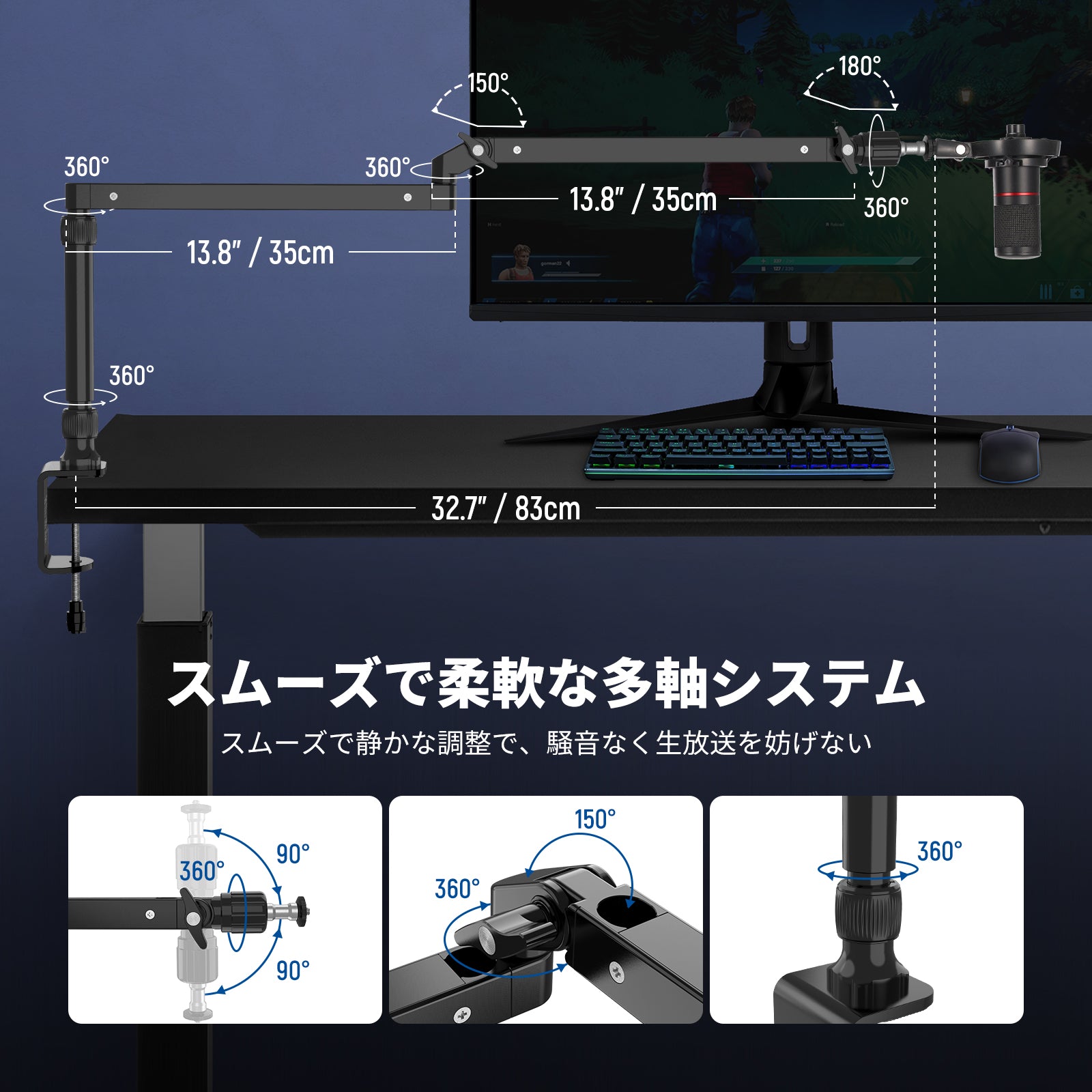 - 【スムーズで柔軟なマルチ軸システム】卓上マイクホルダースタンドは、5軸リンケージを備え、ベースで水平に360°回転し、ジョイントで360°回転し150°傾斜し、上部で360°パンし180°傾斜し、ストリーミングを台無しにするような気が散る音なしで動きます。卓上マイクブームアームは完全に伸ばすと32.7"/10mまで伸び、各ブームアームの長さは13.8"/4mで、様々な高さと角度のニーズに対応します。