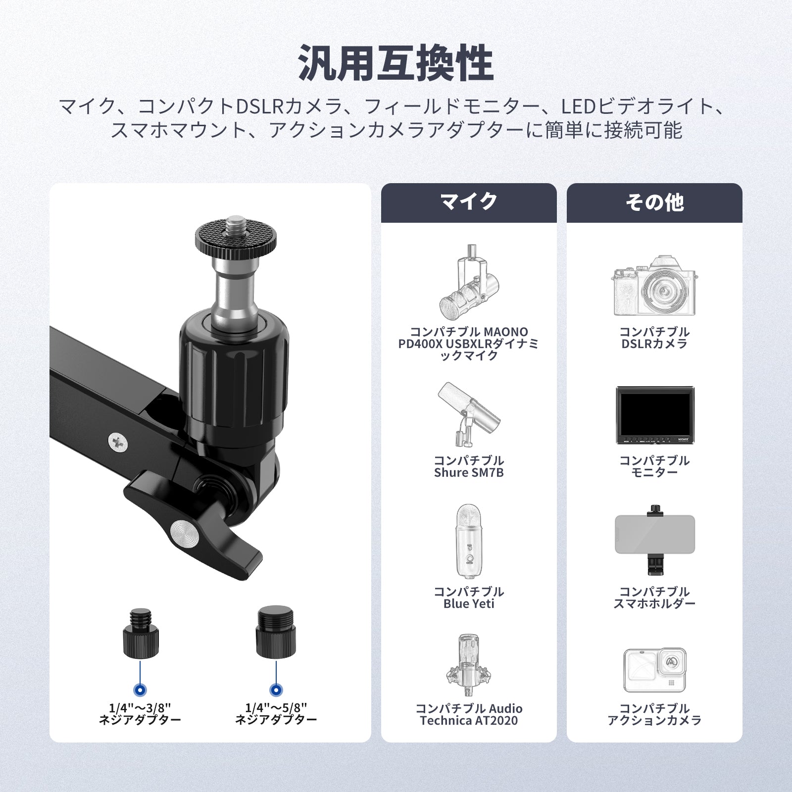 【幅広い互換性】上部1/4"ネジ、1/4"から3/8"、1/4"から5/8"ネジのアダプターを使用すると、マイク、コンパクトDSLRカメラ、ウェブカメラ、フィールドモニター、LEDビデオライト、スマホタブレットホルダー、アクションカメラアダプター(すべて別売)のような機器や撮影アクセサリーを簡単に切り替えて取り付けます。オフィスや家庭での使用に適しており、オーバーヘッドマイク卓上クランプスタンドマジックアームセットアップは、ビデオポッドキャスト、レコーディングスタジオ、生放送、Zoom通話、オンライン会議、教育、ゲームに最適です。