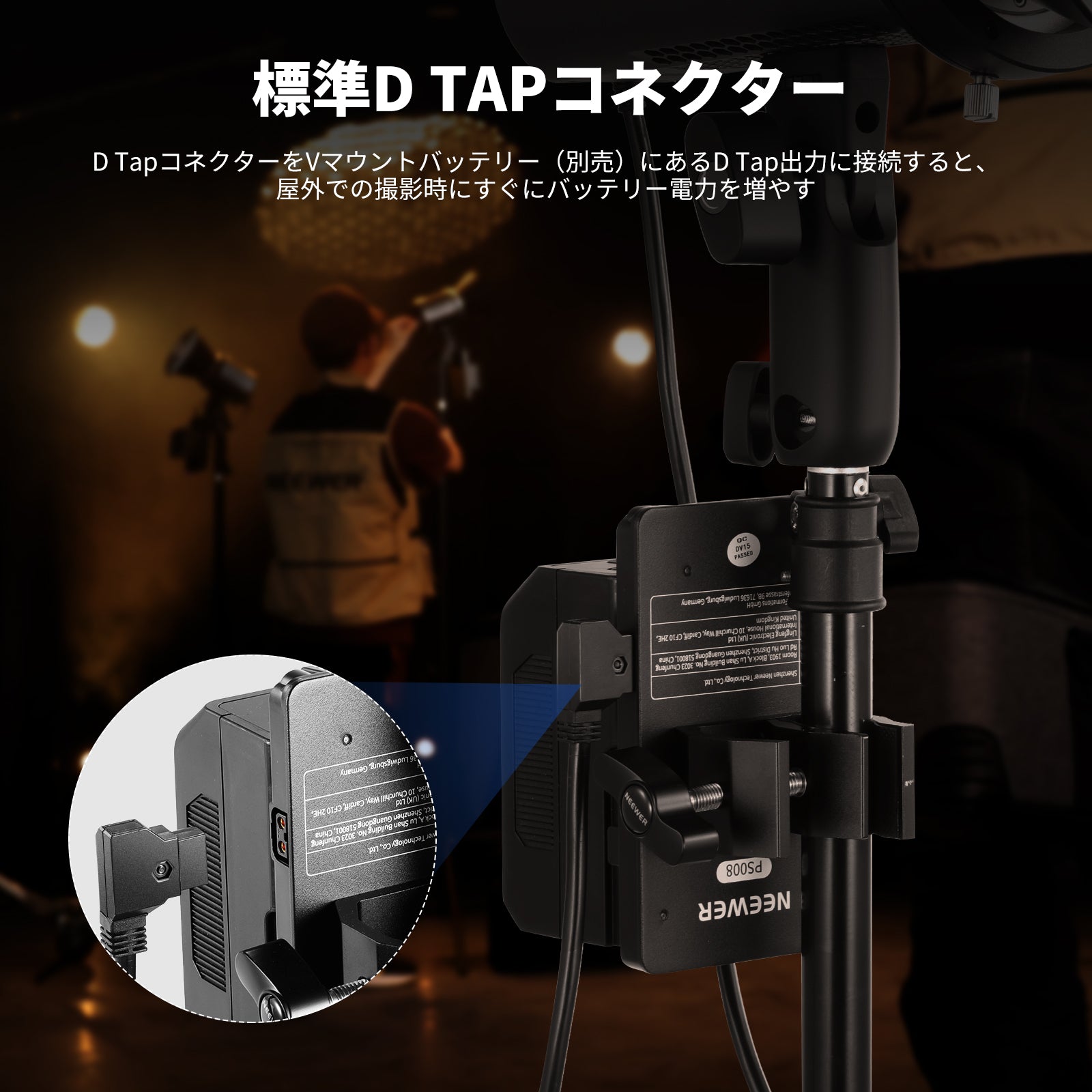 - 【標準D-Tapコネクタ】D-TapコネクタをVマウントバッテリー (別売) にある D-Tap 出力に接続すると、屋外撮影用にすぐにバッテリー電力を増やすことができます。