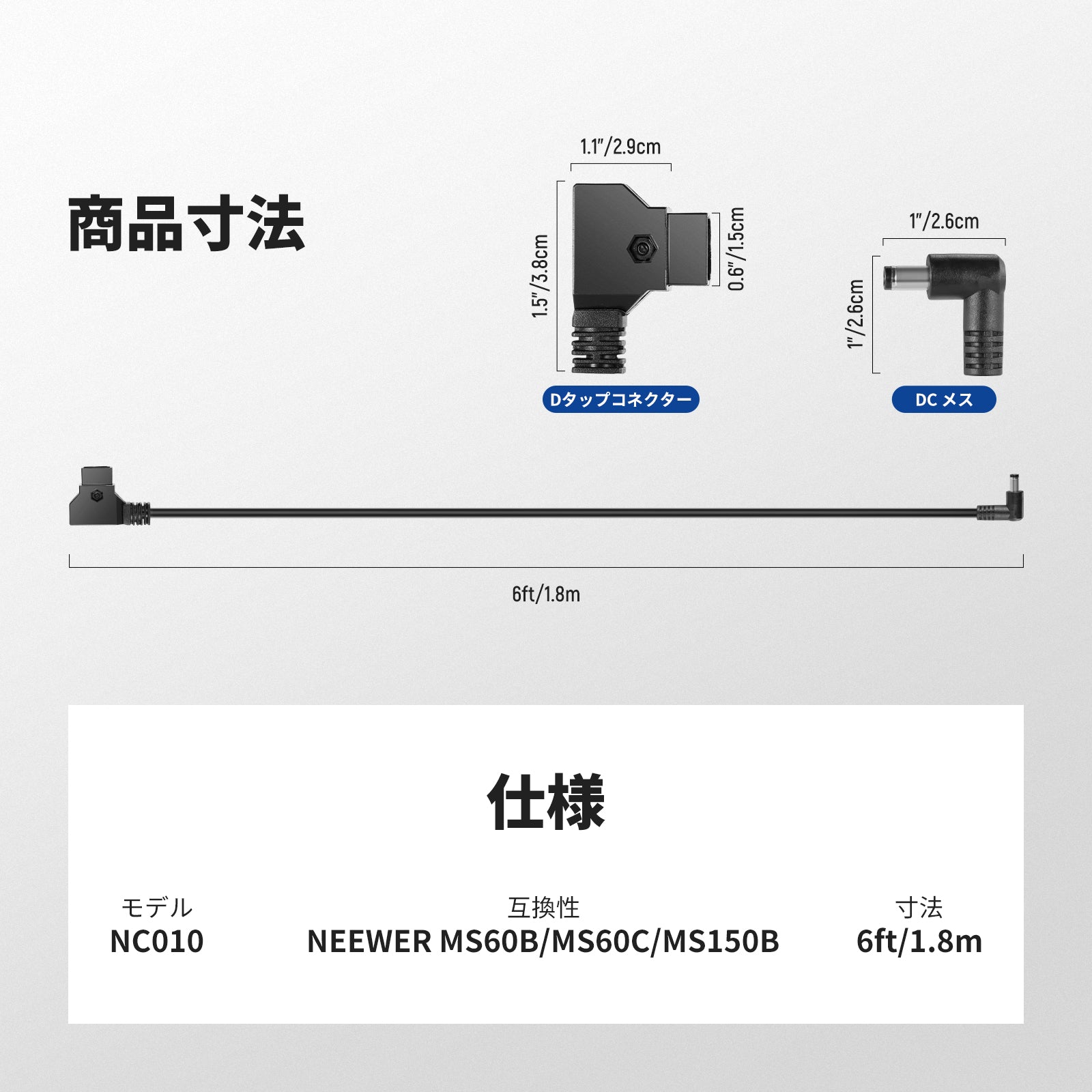 NEEWER NC010 1.8m D-Tap オス-DCメス電源ケーブル MS60 MS60B MC60C MS150B ビデオライト用