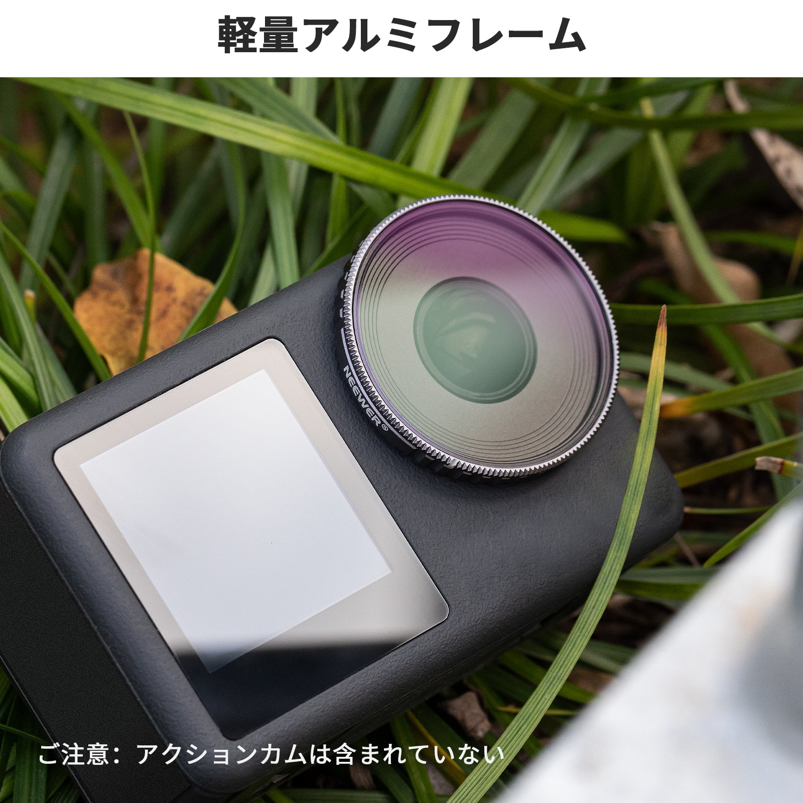 【軽量アルミフレーム】アルミ合金フレームを採用し、各フィルターの重量はわずか0.15オンス/4.3gで、軽量で頑丈です。CNC 機械加工および研磨されたフィルターは、アクションカメラに重量を加えることなく、レンズに完全にフィットします。着脱が簡単でアウトドアスポーツや冒険の撮影に最適!