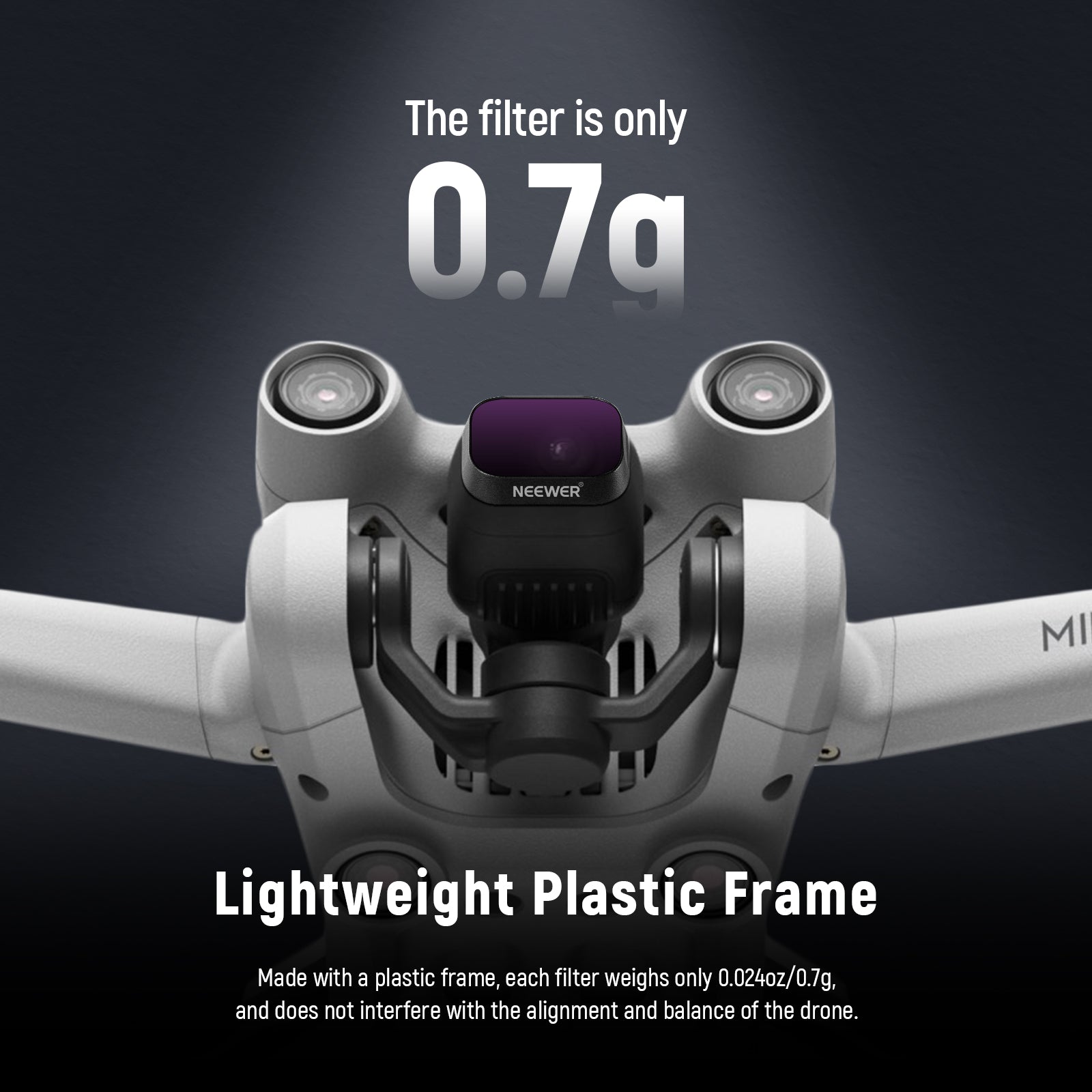 【軽量プラスチックフレーム】プラスチックフレームとCNC滑り止め設計で構築されたフィルターは、MINI 3 Proレンズへの取り付けと取り外しが簡単です。重さはわずか0.7gで、各フィルターはドローンのキャリブレーションとバランスに影響しません。