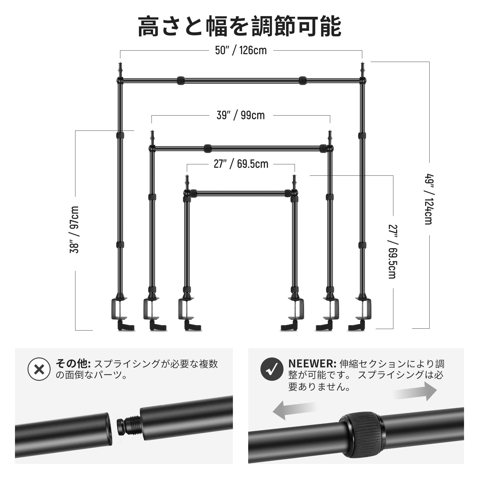 - 【素早く簡単な組み立て】卓上スタンドをクランプし、クロスバーを取り付け、お好みの高さと幅に調整するだけの3ステップで完了します。ロックノブは強力なCクランプでスタンドをしっかりと締め付け、便利なツイストロックにより、高さは 27.2"-48.0"/69cm-122cm に、幅は 25.2"-47.2"/64cm-120cmに簡単な調整が可能です。チューブ上の正確な目盛りマークはより効率的な高さを調整することができます。