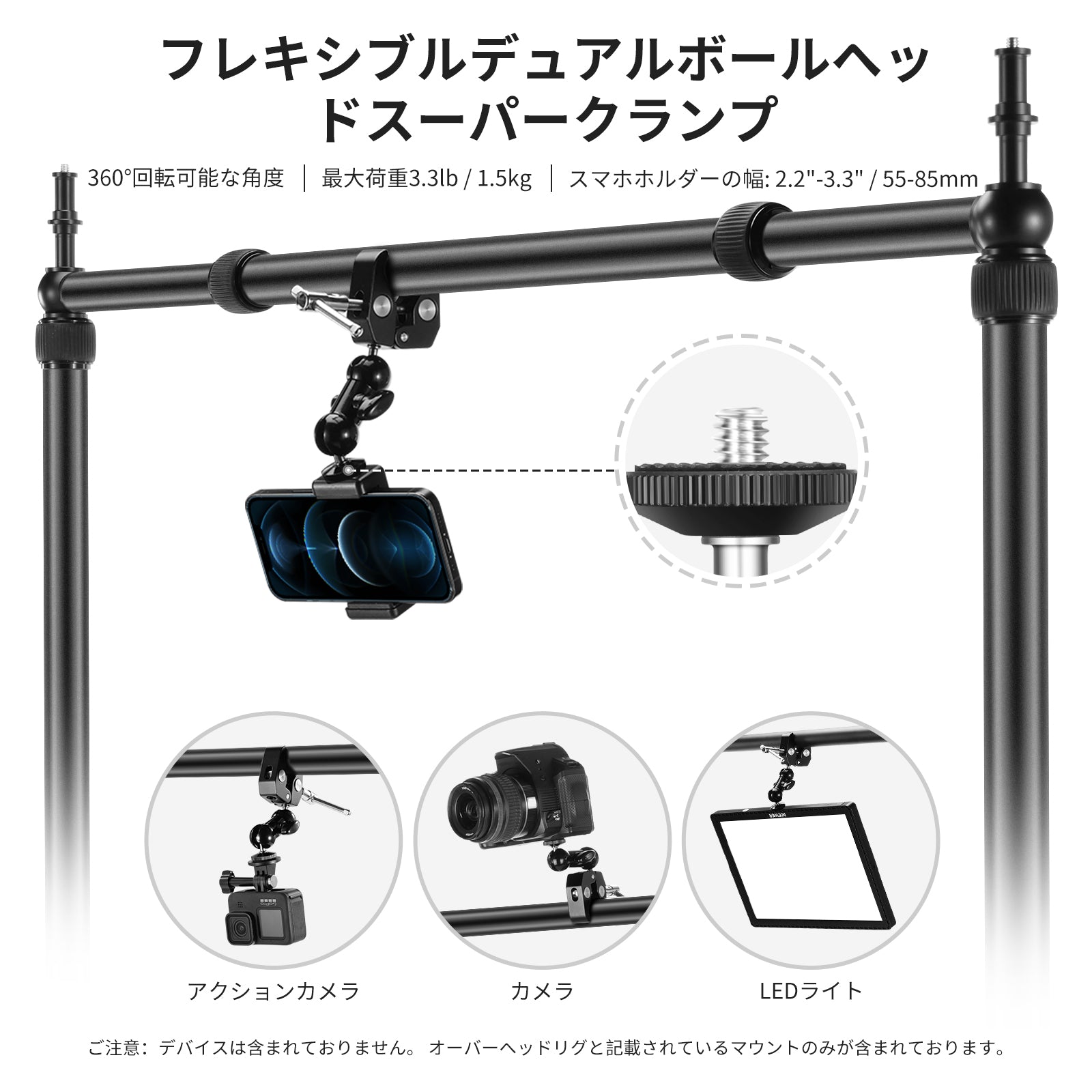 - 【柔軟なデュアルボールヘッドスーパークランプ】柔軟な360°デュアルボールヘッドは、オーバーヘッド撮影ビューに合わせて任意の角度に調整でき、もう一方の端のスーパークランプは手で締めるノブでクロスバーにしっかりと取り付けられます。1/4"ネジには、スマホホルダー (付属)、モニター、マイク、LEDライトなどのアクセサリーを取り付けることもできます。最大荷重は1.5kg/3.3lbです。