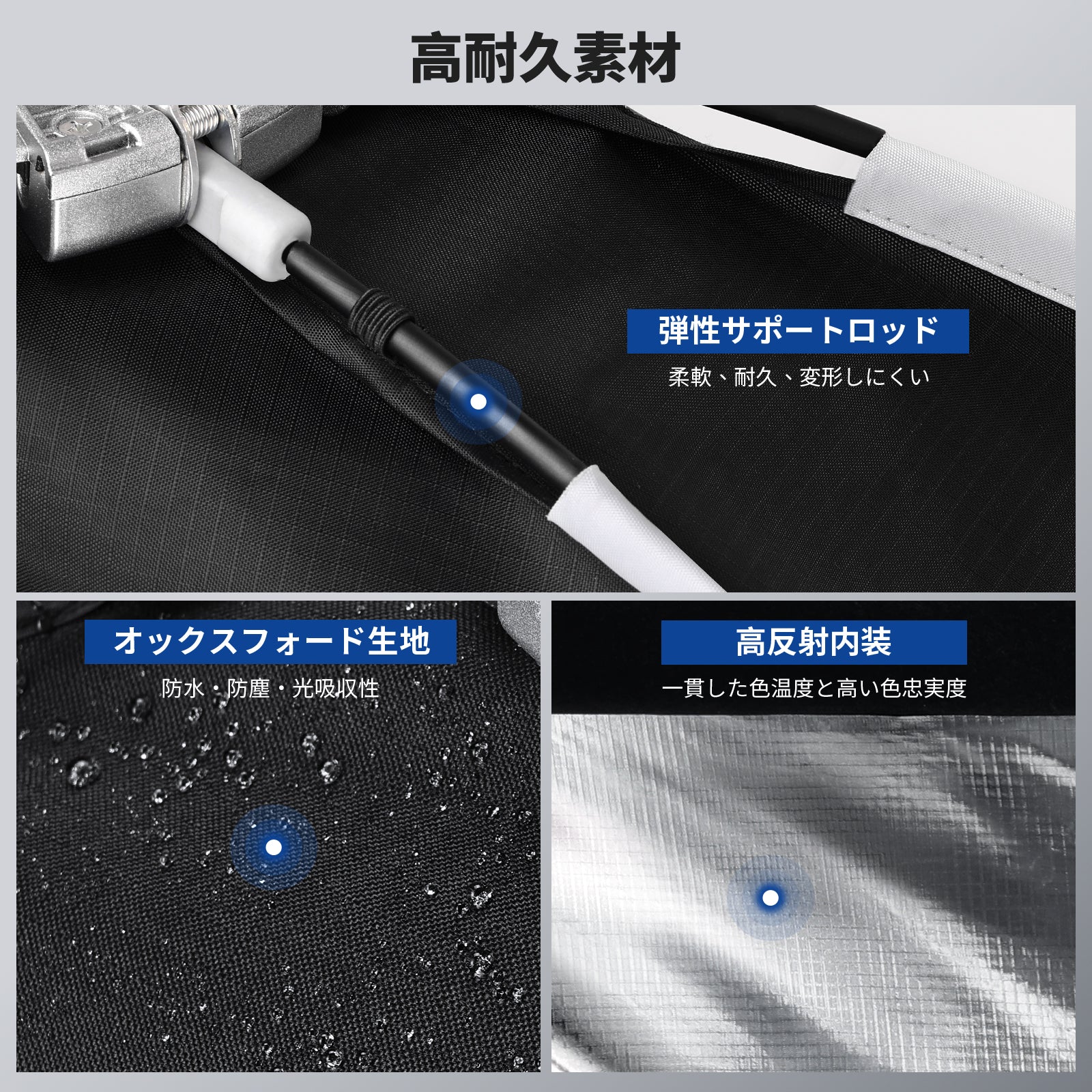 【折りたたみ可能&幅広い用途】折りたたみ式ソフトボックスは折りたたむと (72 x 19 x 19cm)、メッシュポケットが付いたキャリングバッグに簡単に収まります。結婚式、パーティー、ポートレート、商品写真、ファッション撮影などに最適です。壁または天井マウント (別売) を使用すると、あたかも被写体の上の高い窓から光が差し込んでいるかのように、より広い空間のような錯覚を生み出します。