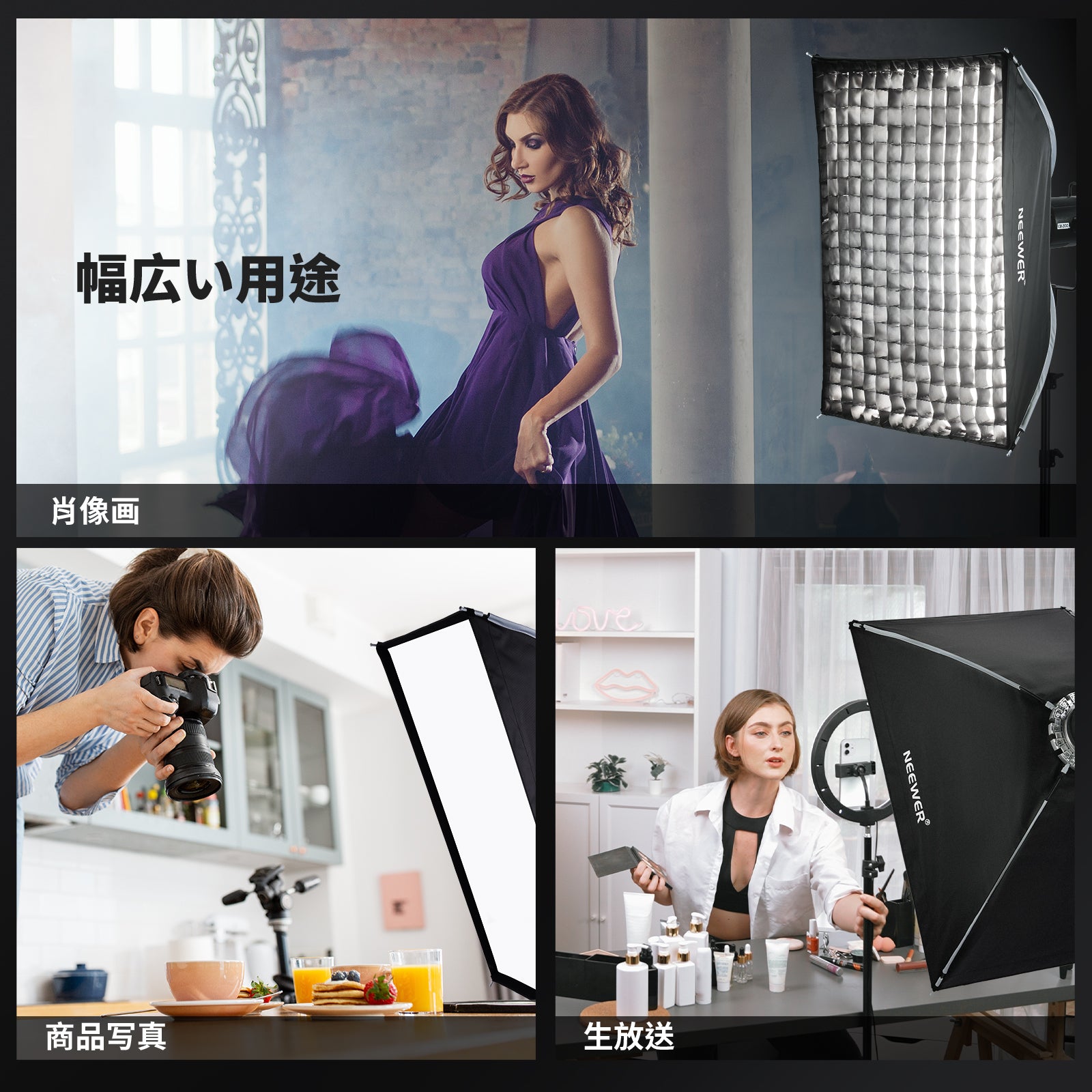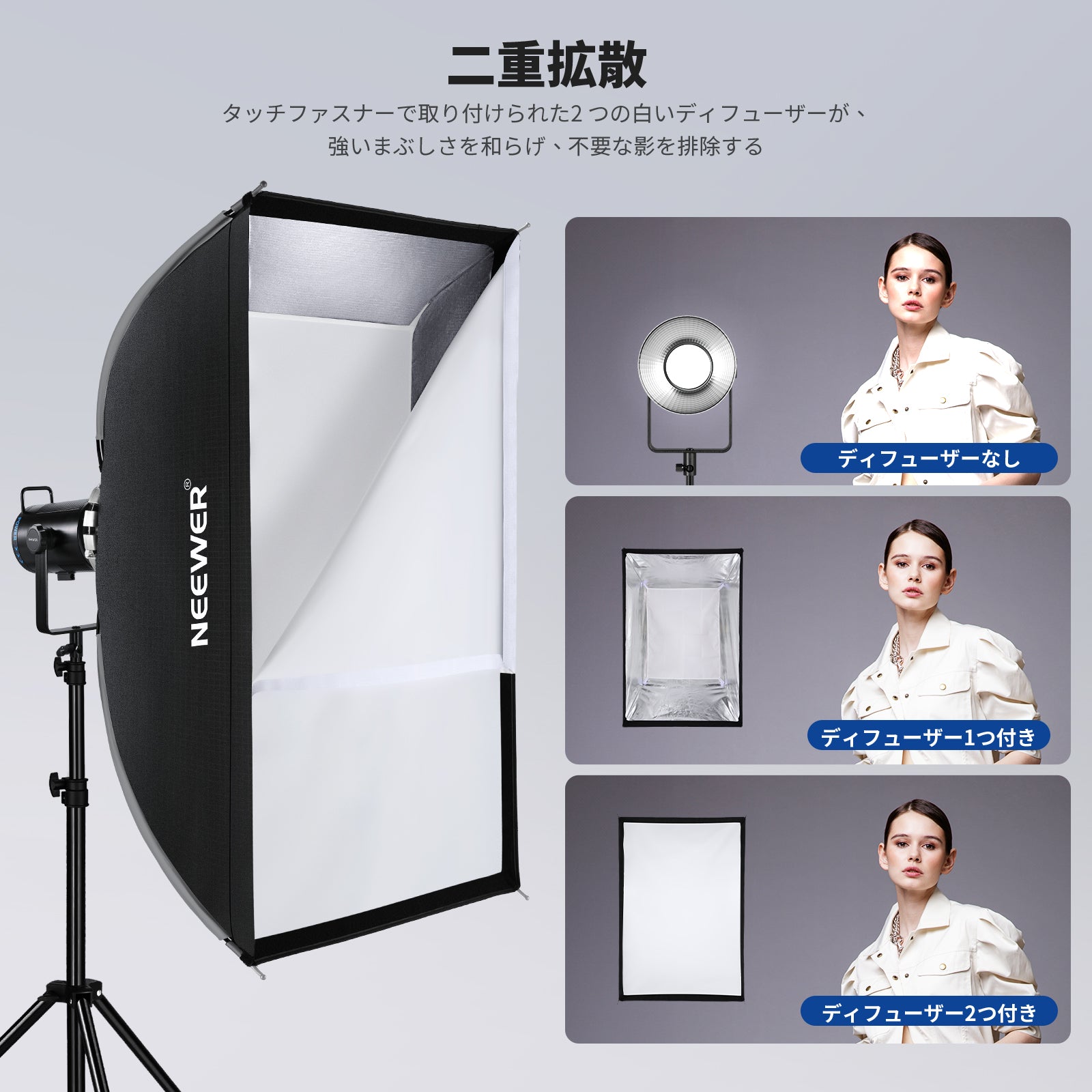 - 【ポータブルビデオライト/屋外用フラッシュソフトボックス】24"x35" (60 x 90cm)長方形ストリップ ソフトボックスは光沢のあるシルバーの裏地が特徴で、出力を広げて拡散させると同時に中間の演色評価数 (CRI) と色温度を維持できます。均一な配光により、傷や影が最小限に抑えられ、肌を滑らかにし、顔の構造を明確にすることができます。