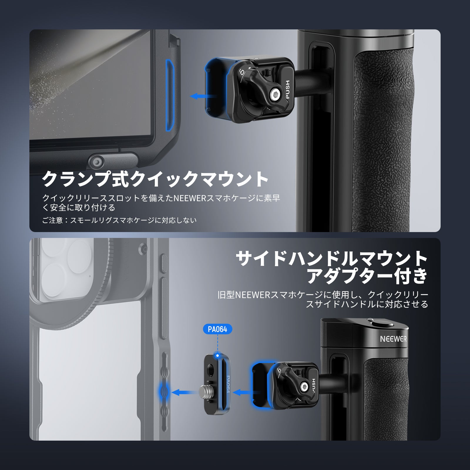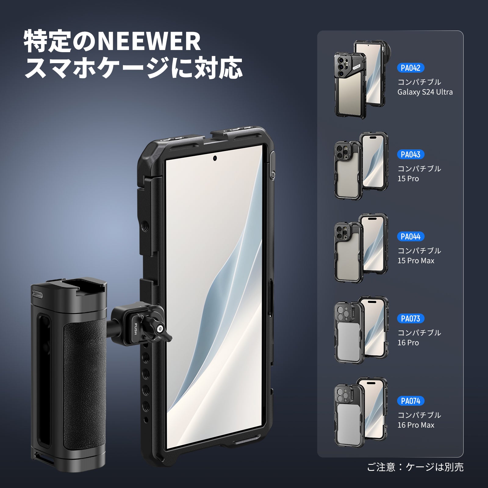- 【特定のNEEWERスマホケージ用】PA073(16Pro用)、PA074(16Pro Max用)、PA043(15Pro用)、PA044(15Pro Max用)、PA042(Galaxy S24 Ultra用)を含む、クイックリリースクランプ取り付けスロットを備えたiPhone Samsungに対応するNEEWERスマホケージアクセサリーモデル専用です。その他のNEEWERスマホケージの場合は、PA064クイックリリースアダプターを別途購入して取り付けてください。