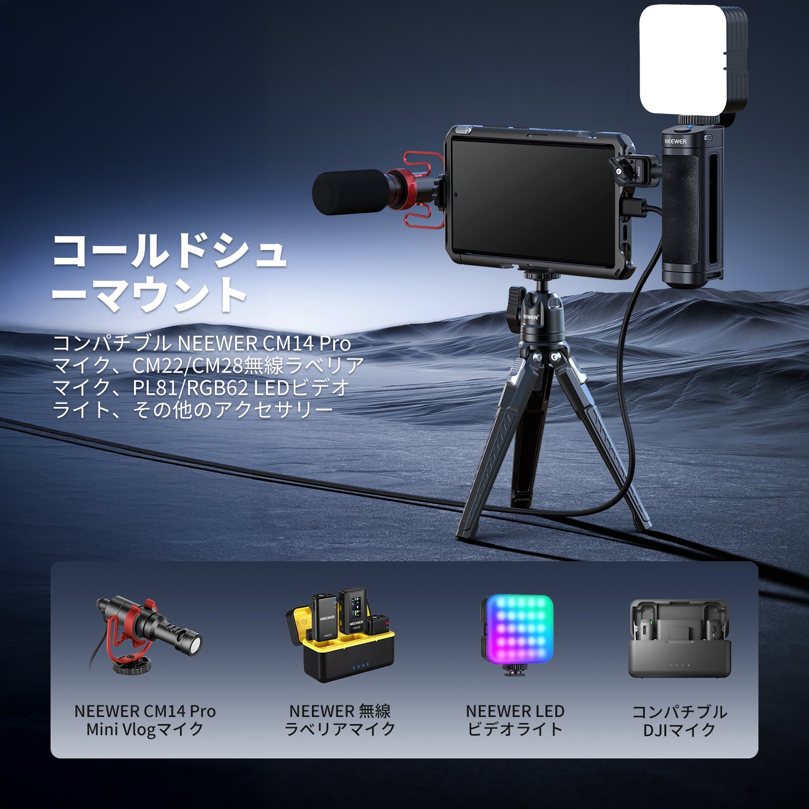 【コールドシューブラケット&リストストラップスロット】コールドシューマウントは、CM14プロマイク、CM22/CM28無線ラベリアマイク、PL81/RGB62 LEDビデオライトなどのNEEWERアクセサリーと互換性があります。使用中の落下を防ぐため、スロットにリストストラップを結びます。