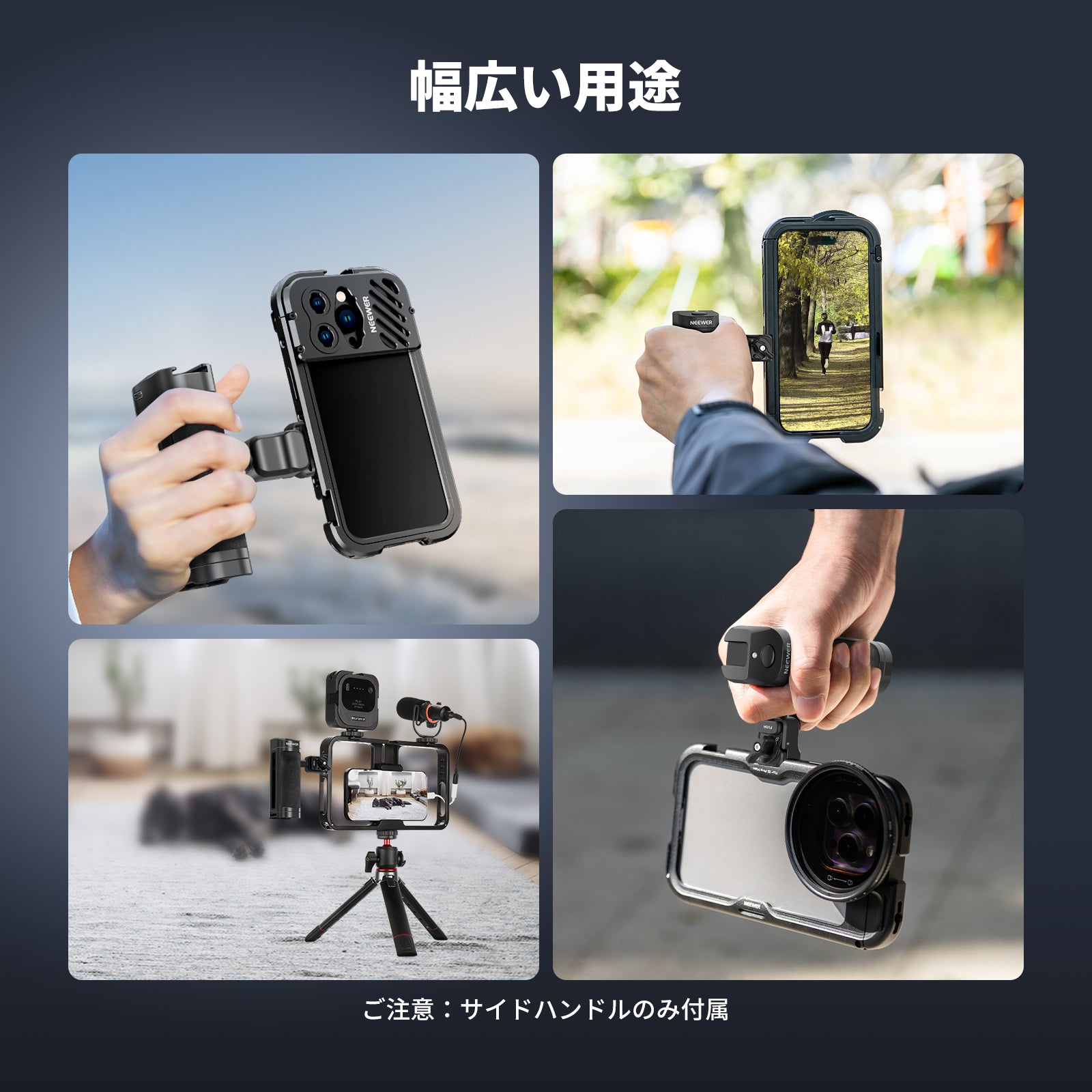 - 【便利なクランプオンアタッチメント】クイックリリースクランプアクセサリーを使用すると、サイドハンドルは、迅速にスマホケージに取り付け、ロックノブで固定します。コンテンツクリエイターの必須ギアやインフルエンサーの必需品として、屋外ビデオ撮影、映画制作、撮影、ビデオ撮影、Vlogging、生放送、モバイル撮影に最適です。
