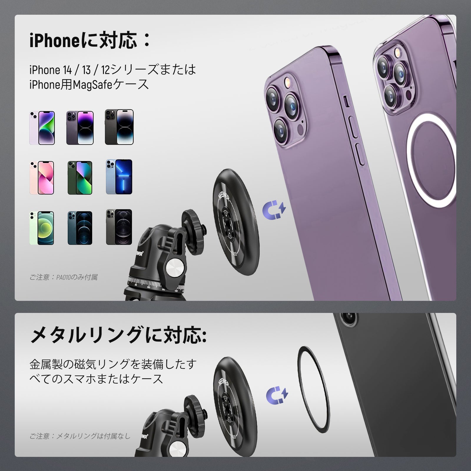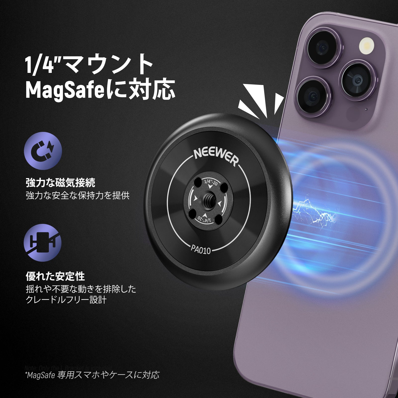 【シームレスな対応】NEEWER マグネット式スマホマウントは、16 15 Pro Max、16 15 Plus14 Pro Max14 Pro14 Plus1413 Pro Max13 Pro13 Plus1313mini12 Pro Max12 Pro12 Plus、12、12 miniのiPhone MagSafe システムに対応します。これはビデオブログデバイスに最適なコンパニオンであり、iPhone 14 Pro Max/14 Pro用のMagSafeケースカバーおよびNEEWER スマホケージ PA006 および PA011 とシームレスに対応し、MagSafe 以外のスマートフォンの場合は、互換性を確保するためにマグネットスマートフォンケースまたはリングを使用してください。