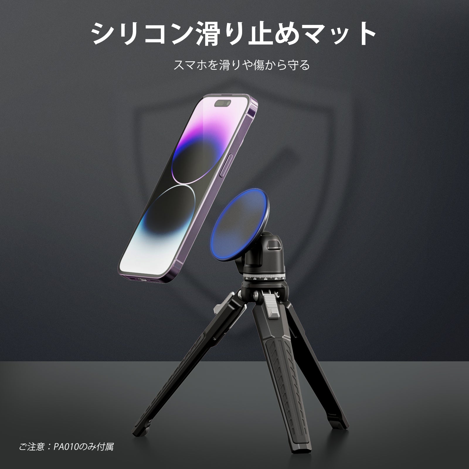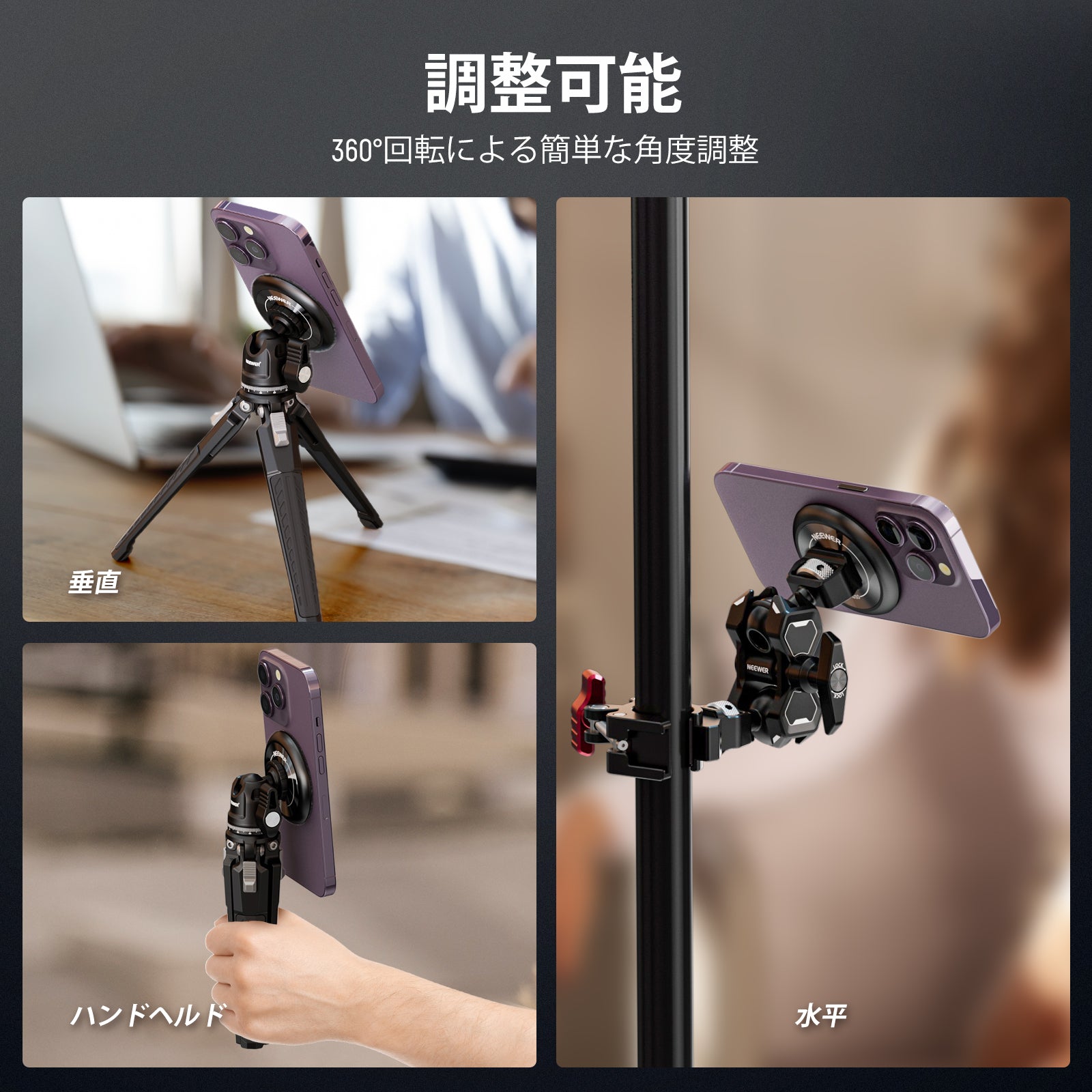 【しっかりとしたマグネットグリップ】このマグネット式スマホマウントアダプターを使用すると、スマホが所定の位置にしっかりと固定されます。強力なマグネットによりしっかりとしたグリップ(最大マグネット負荷: 21oz/600g)が提供され、デバイスを安定させ、偶発的な滑りや落下を防ぎます。安全性を心配することなく、さまざまな撮影シーンで安心してスマホを使用できます。