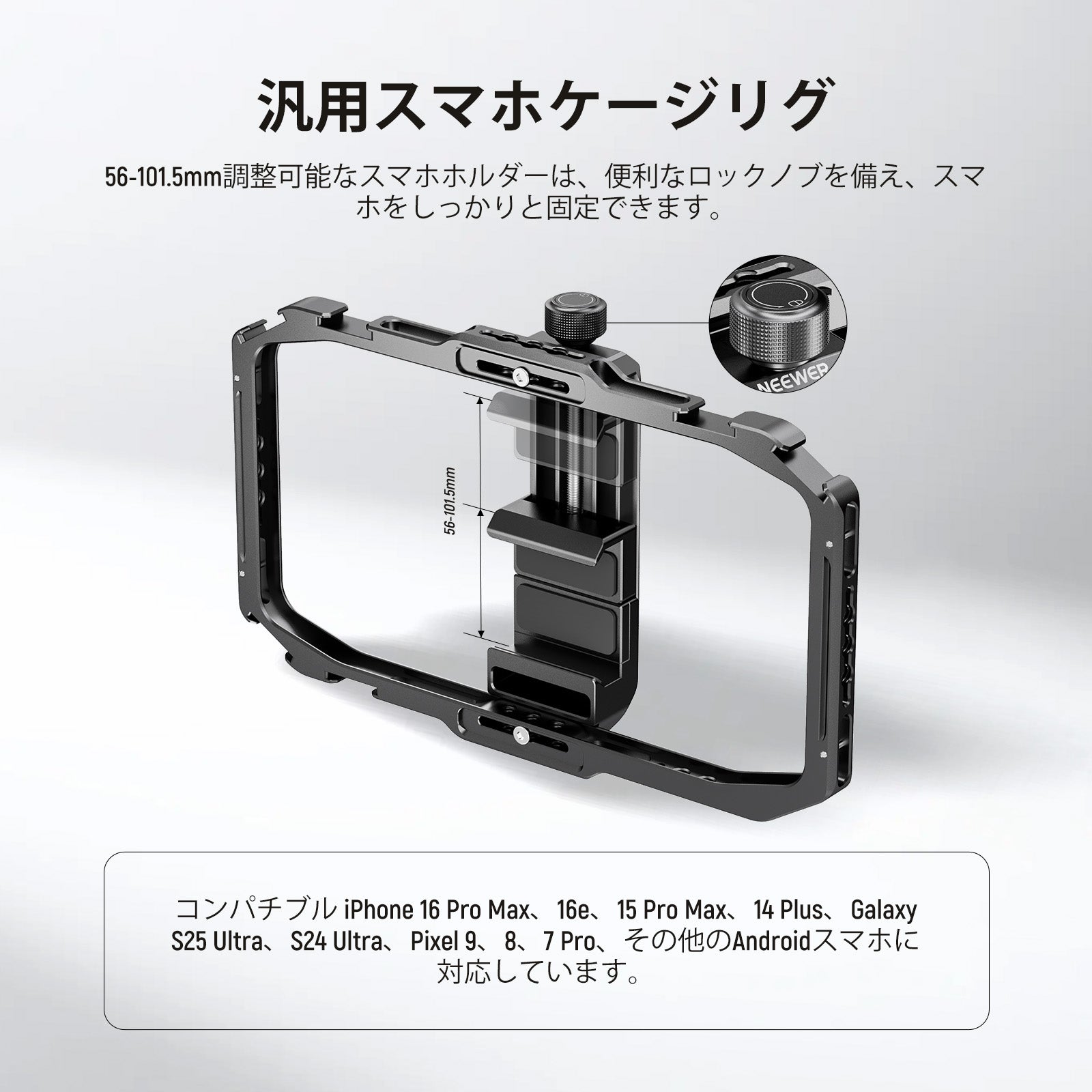 - 【汎用スマホケージリグ】スマホホルダーは2.2"-4"(56-101.5mm)調整可能で、便利なロックノブを備え、お使いの携帯電話をしっかりと支えます。コンパチブ iPhone 16 Pro Max/16e/15 Pro Max/14 Plus/Galaxy S25 Ultra/S24 Ultra/Pixel 9/8/7 Pro。