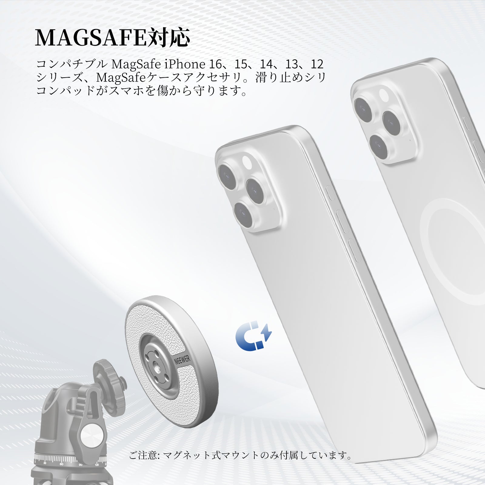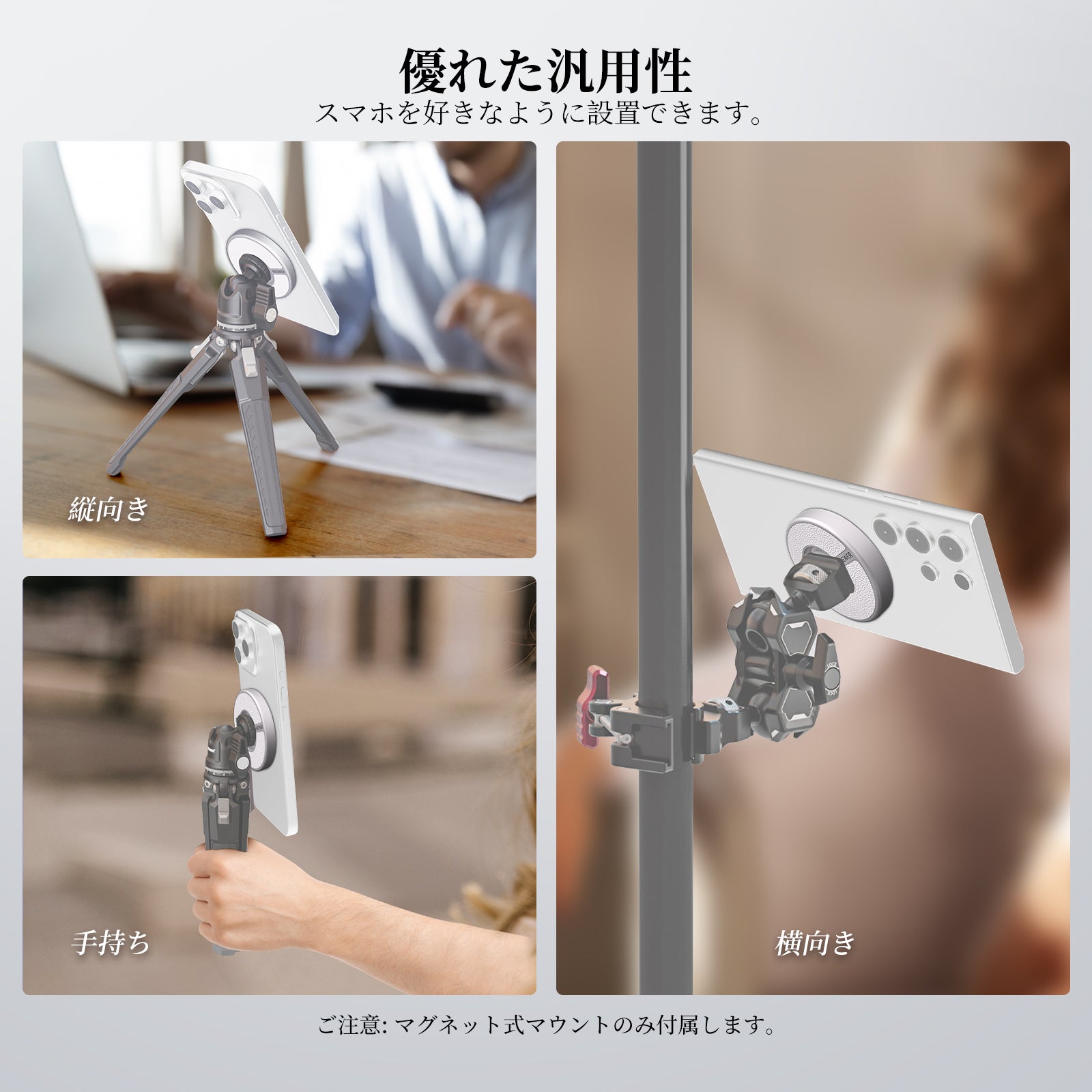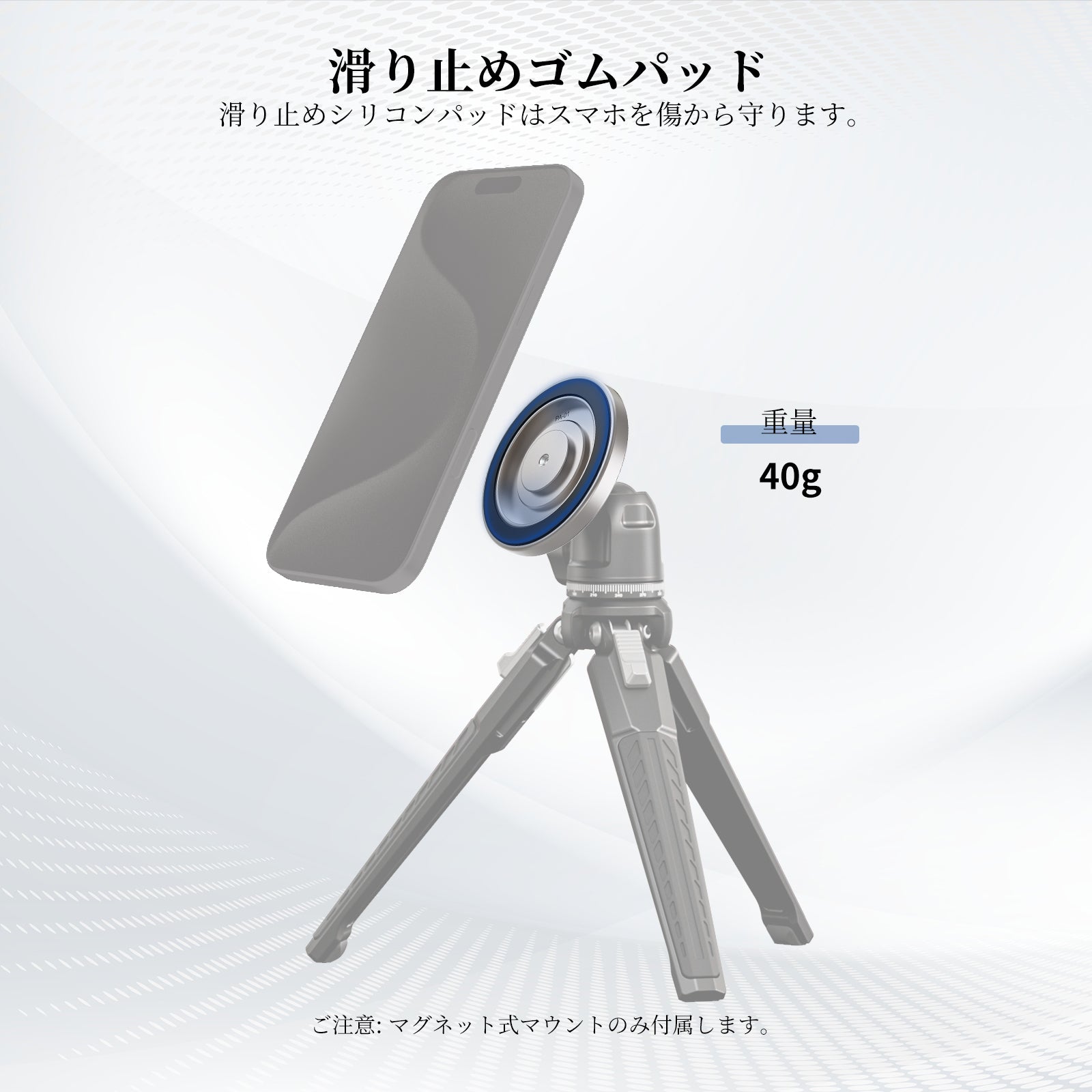- 【強力な磁力】スマホ三脚マウントは強力なマグネットアタッチメントを備え、スマホをしっかりと固定し(最大荷重: 600g)、移動中の撮影中に落下を防ぎます。