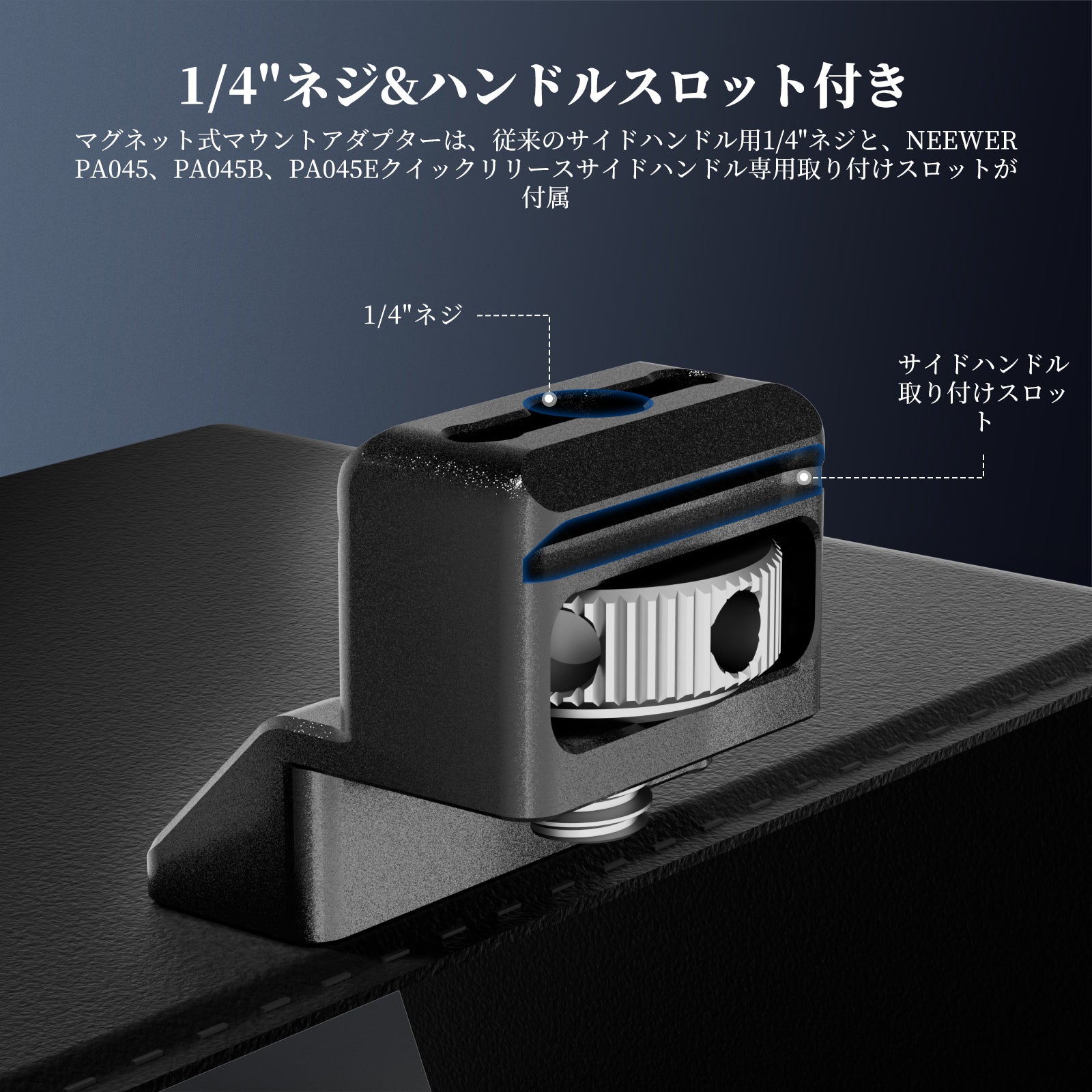 - 【1/4"ネジ&ハンドルスロット付き】マグネットマウントアダプターは、従来のサイドハンドル用1/4"ネジと、NEEWERクイックリリースサイドハンドル専用取り付けスロットを備えています。