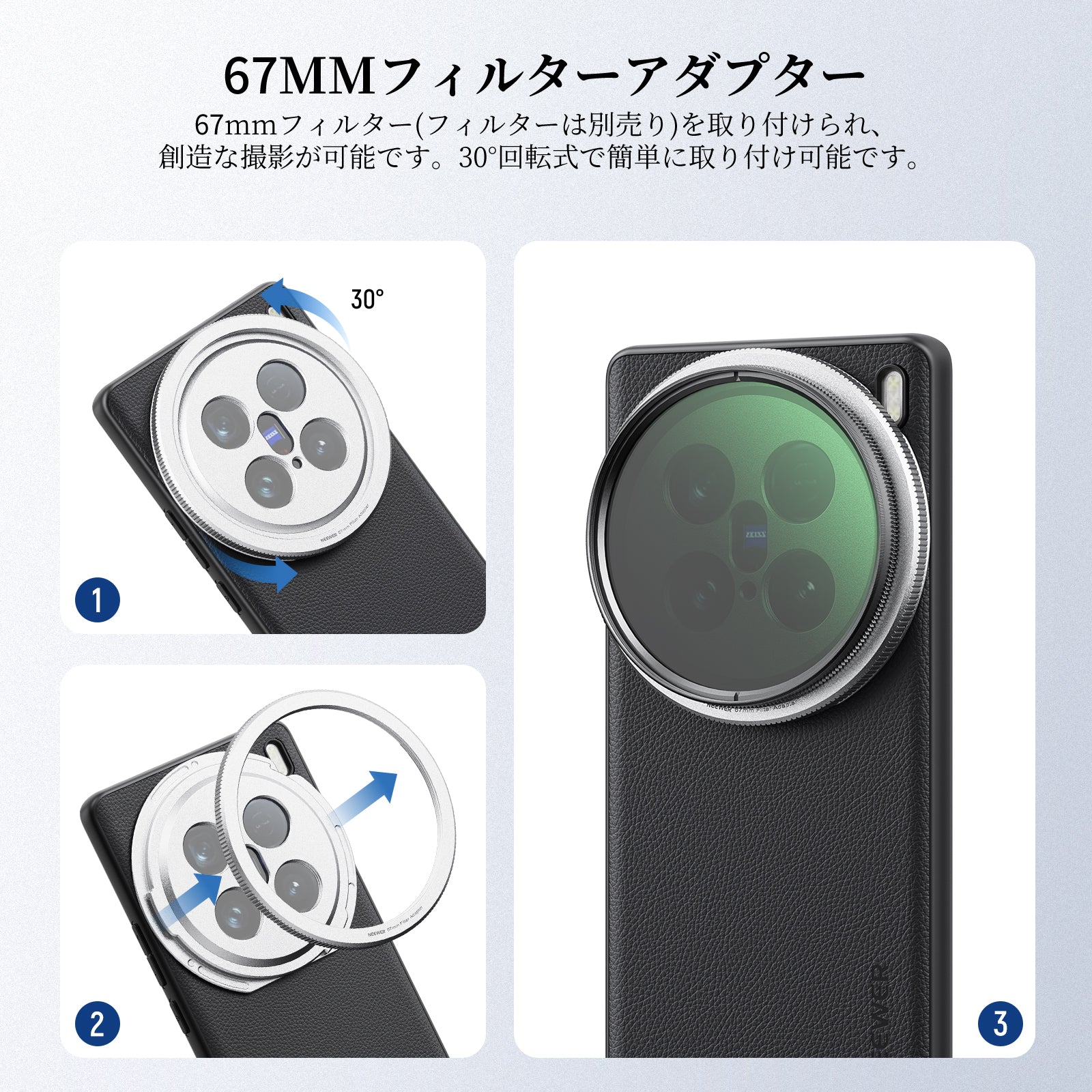 - 【スナップオン式67mmフィルターアダプター】67mmフィルターアダプターを装着し、NDフィルター、CPLフィルター、拡散フィルター、光害フィルター、グラデフィルターなどを取り付け、創造な撮影が可能です(フィルターは別売りです)。