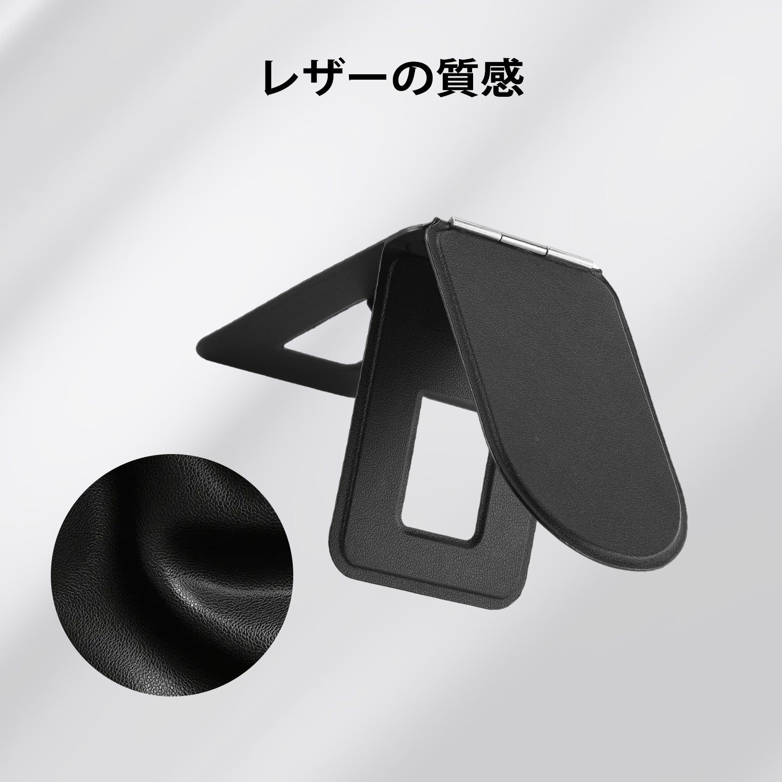 【レザー質感】ヴィーガンレザー製卓上用スマホスタンドは、滑らかな質感で傷や摩耗に強く、お手入れも簡単です。