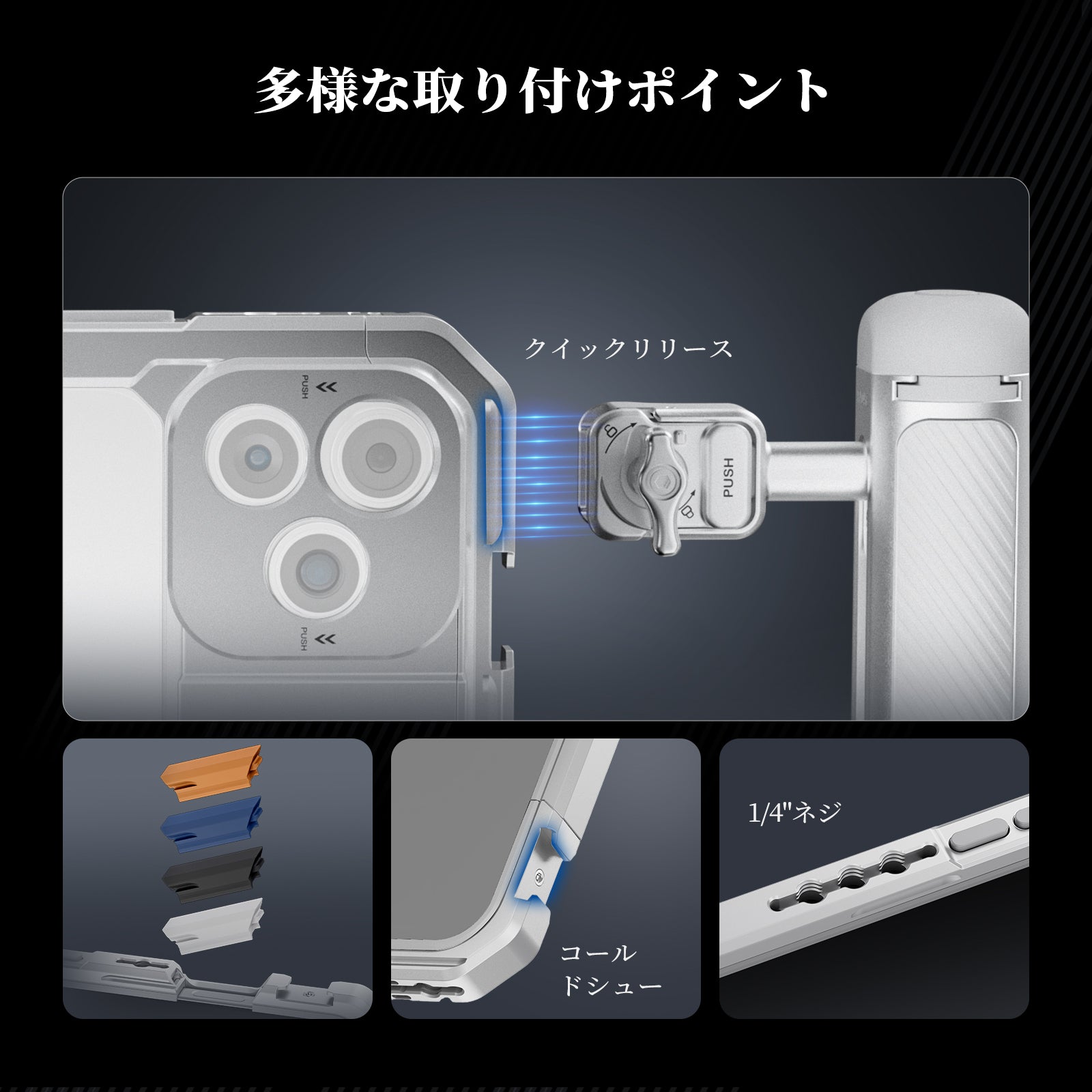 【複数取り付けポイント】スマホケージは、iPhone 17 Pro Maxに対応し、1/4"ネジとコールドシューマウントを備えており、三脚、ハンドグリップ、ハンドルグリップ、LEDライト、ワイヤレスマイク、ジンバルスタビライザーホルダー(スマホカメラでの動画撮影用)、その他コンテンツクリエイター、インフルエンサーにとって必要なアイテム、モバイル撮影や動画撮影用アクセサリーを取り付けられます。