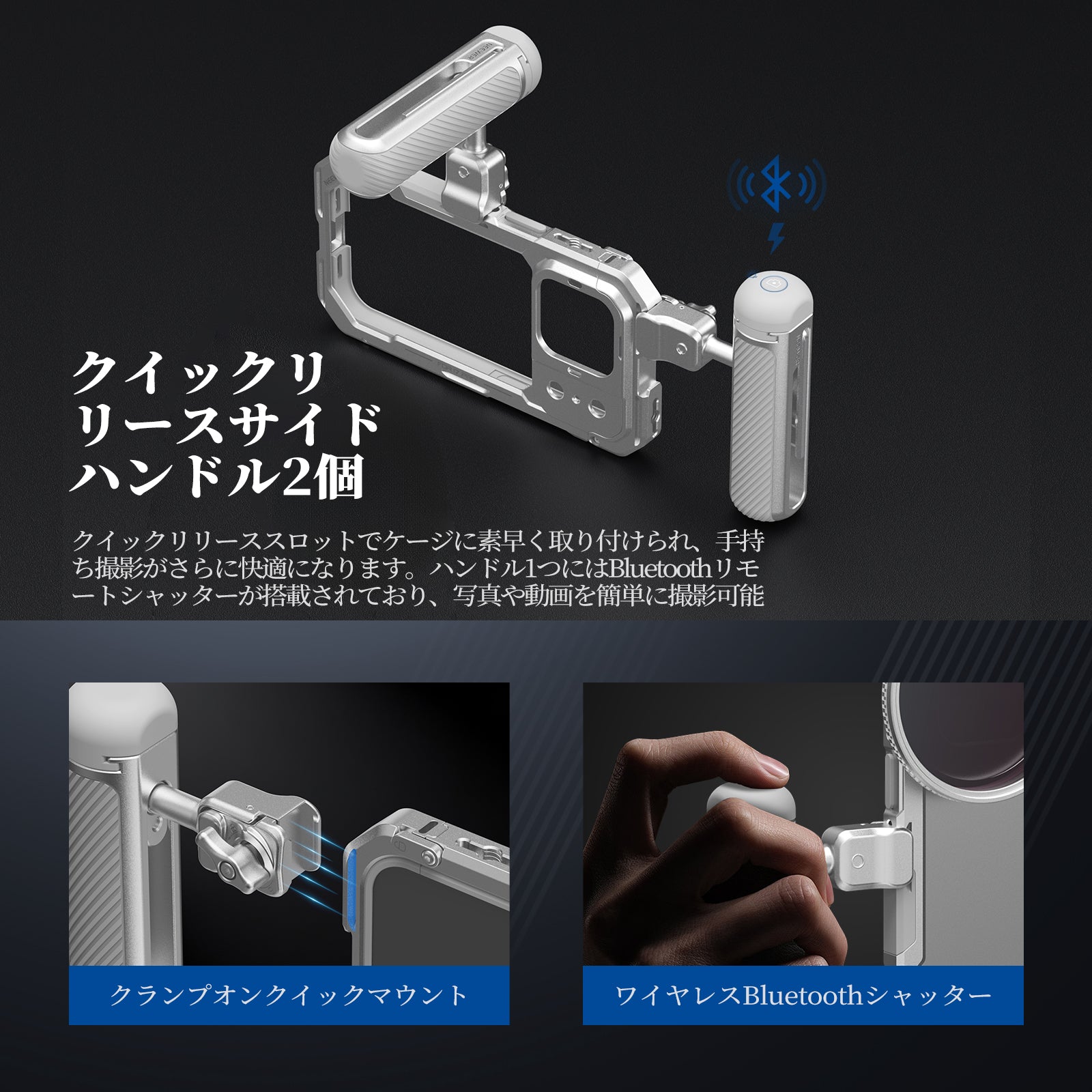 - 【クイックリリースサイドハンドル2個】クイックリリーススロットでケージに素早く取り付けられ、手持ち撮影を快適にします。ハンドル1つにはBluetoothリモートシャッターが付属し、写真や動画を簡単に撮影可能です