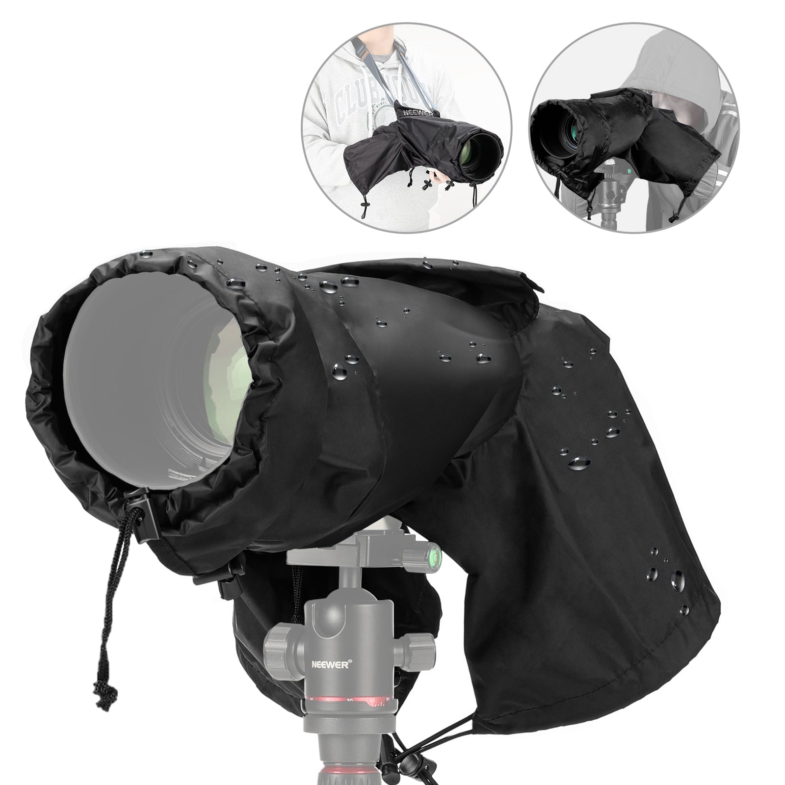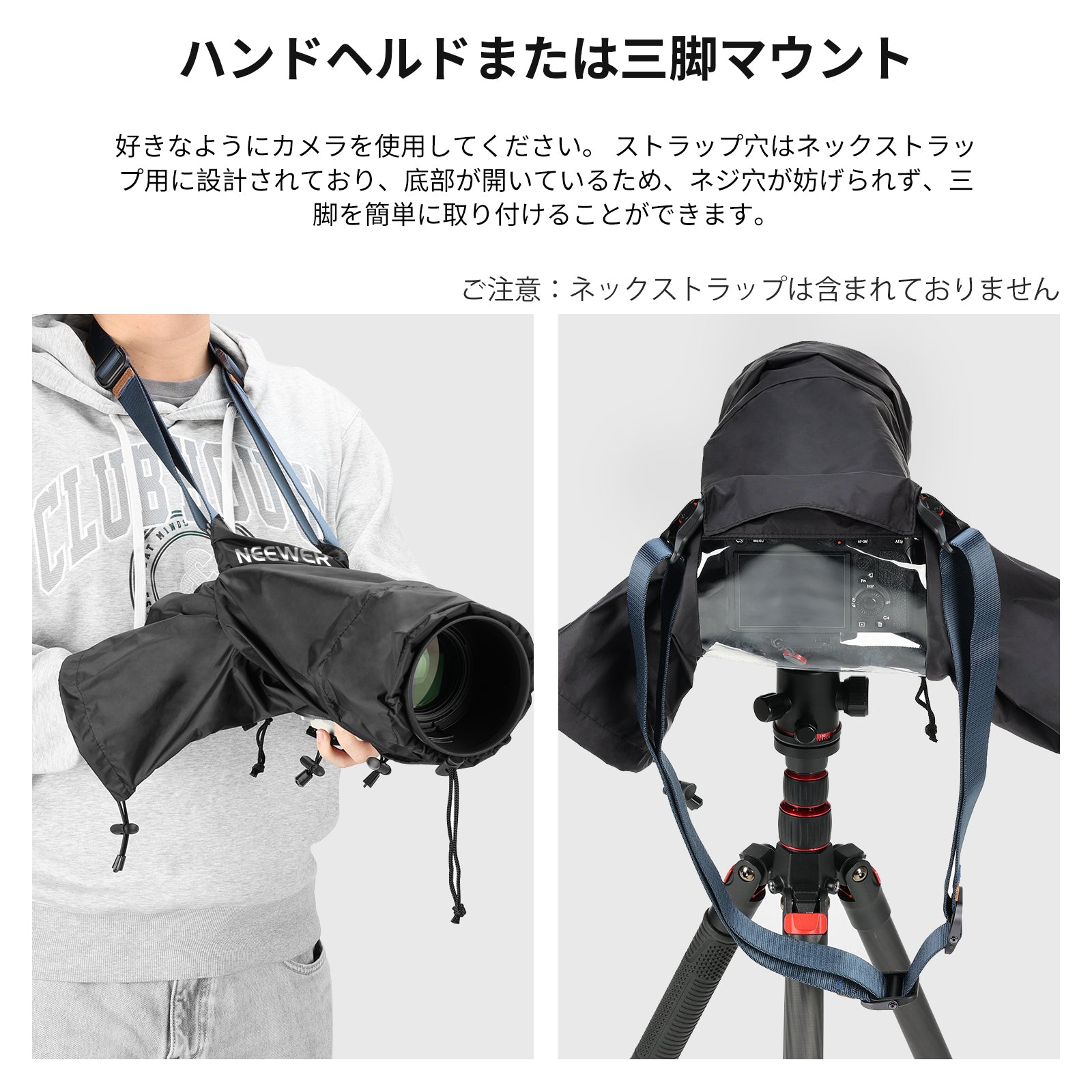 【簡単なアクセス】レインカバーの内側に簡単に入る2つのスリーブで、カメラを簡単に操作できます。カメラストラップは、ストラップホールを通してレインカバーに接続でき、手持ちカメラ撮影を容易にします。