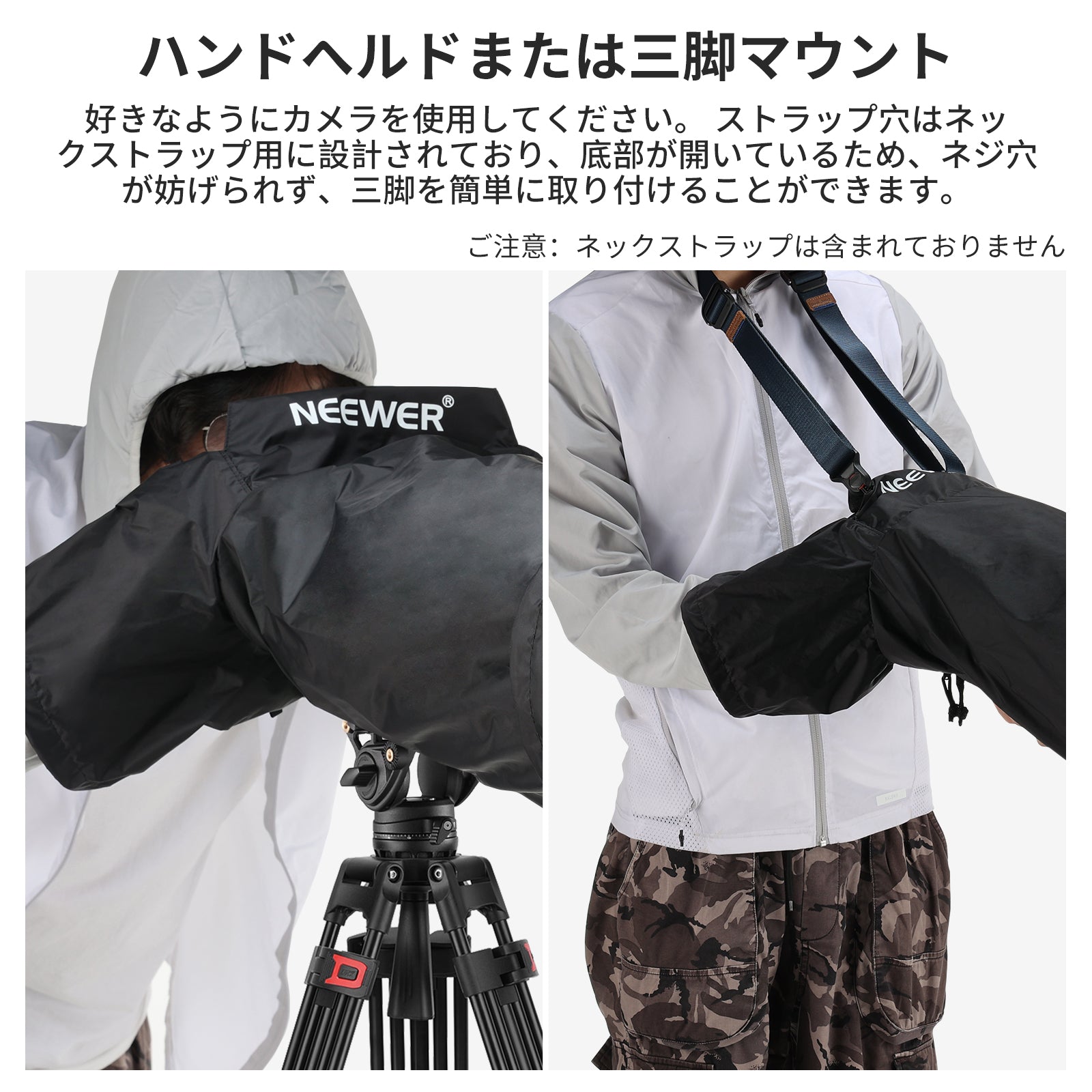 【簡単なアクセス】レインカバーの内側に簡単に入る2つのスリーブで、カメラを簡単に操作できます。カメラストラップは、ストラップホールを通してレインカバーに接続でき、手持ちカメラ撮影を容易にします。