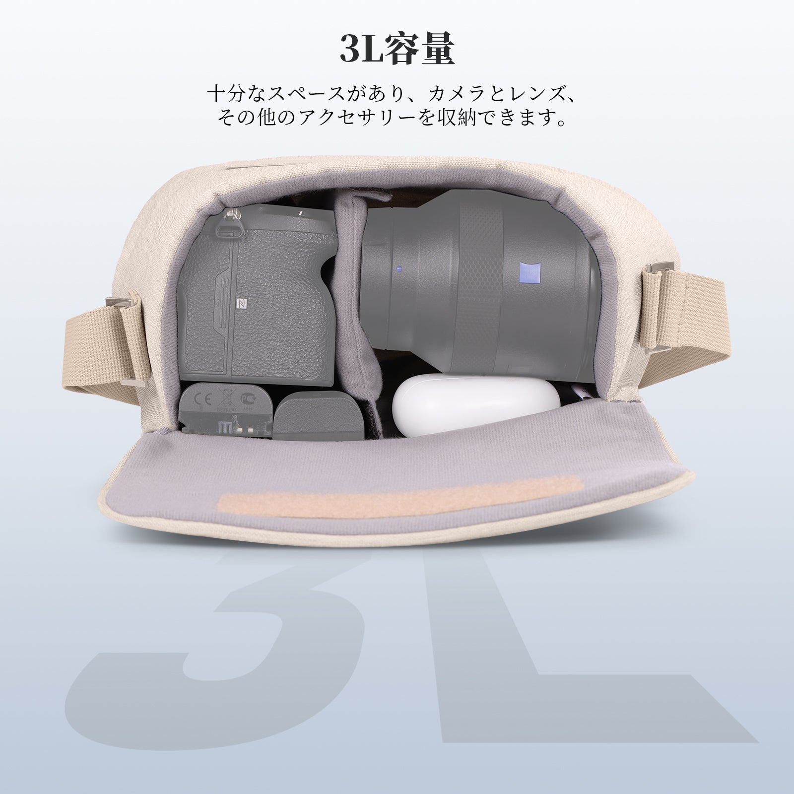 - 【3L容量&取り外し可能な仕切り】カメラスリングバッグは取り外し可能な仕切りを備えており、カメラとレンズを快適に収納できるようにスペースをカスタマイズできます。デジタルカメラキャリングケースは小さなポケットが付き、フィルター、小型レンズポーチ、バッテリーなどの小物をきちんと整理できます。開閉部はループとフックファスナーで簡単にアクセスできます。