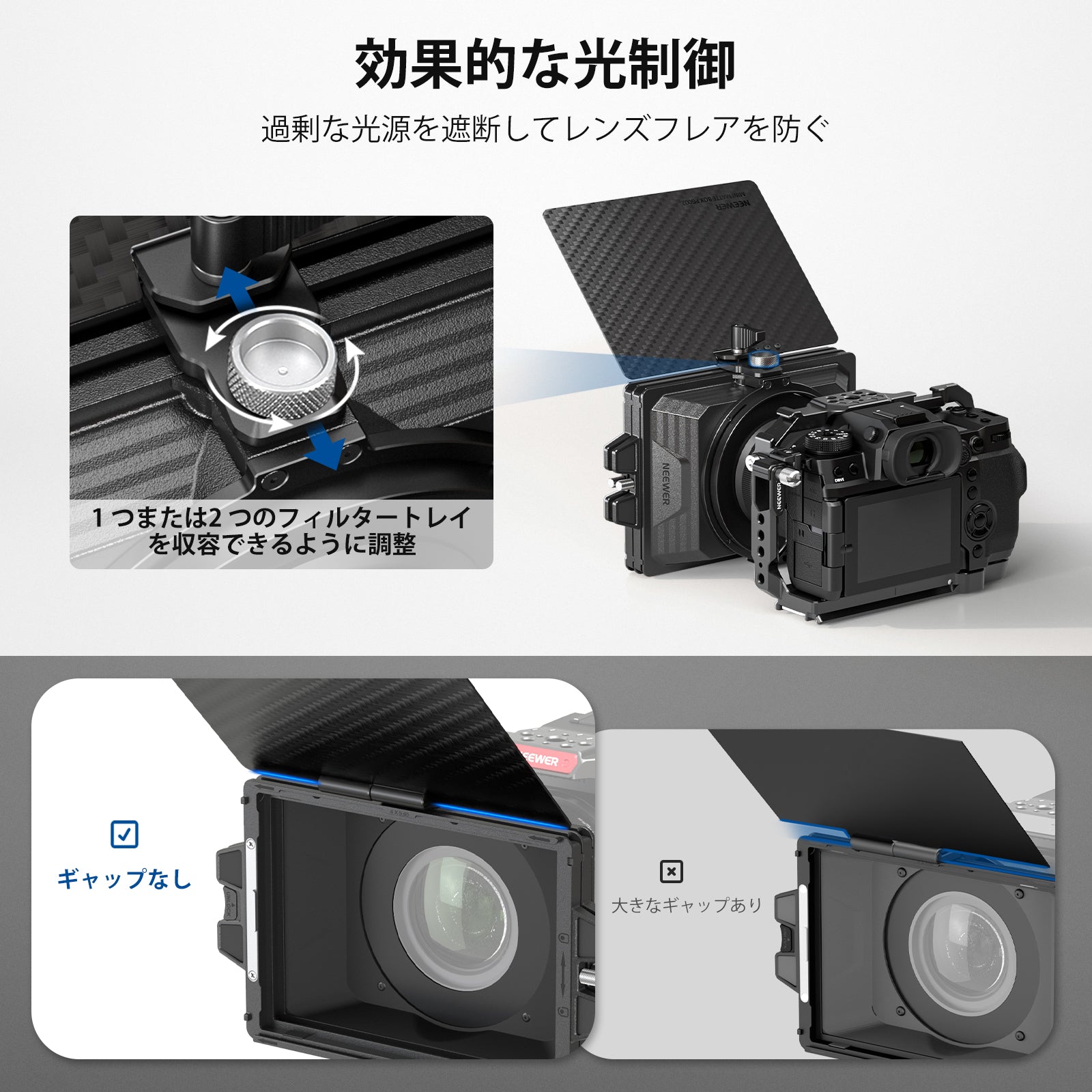 【180°調節可能なトップフラッグ】トップフラグを180°傾けて、余分な光を遮断し、レンズフレアを防ぎます。フラグを折りたたむと、フロントフィルターを覆い、レンズを保護します。トップフラッグロックは、フラッグをしっかりと固定します。つまみネジを使用すると、フラグを前後に調整して、1つまたは2つのフィルタートレイに対応し、光を完全に遮断できます。