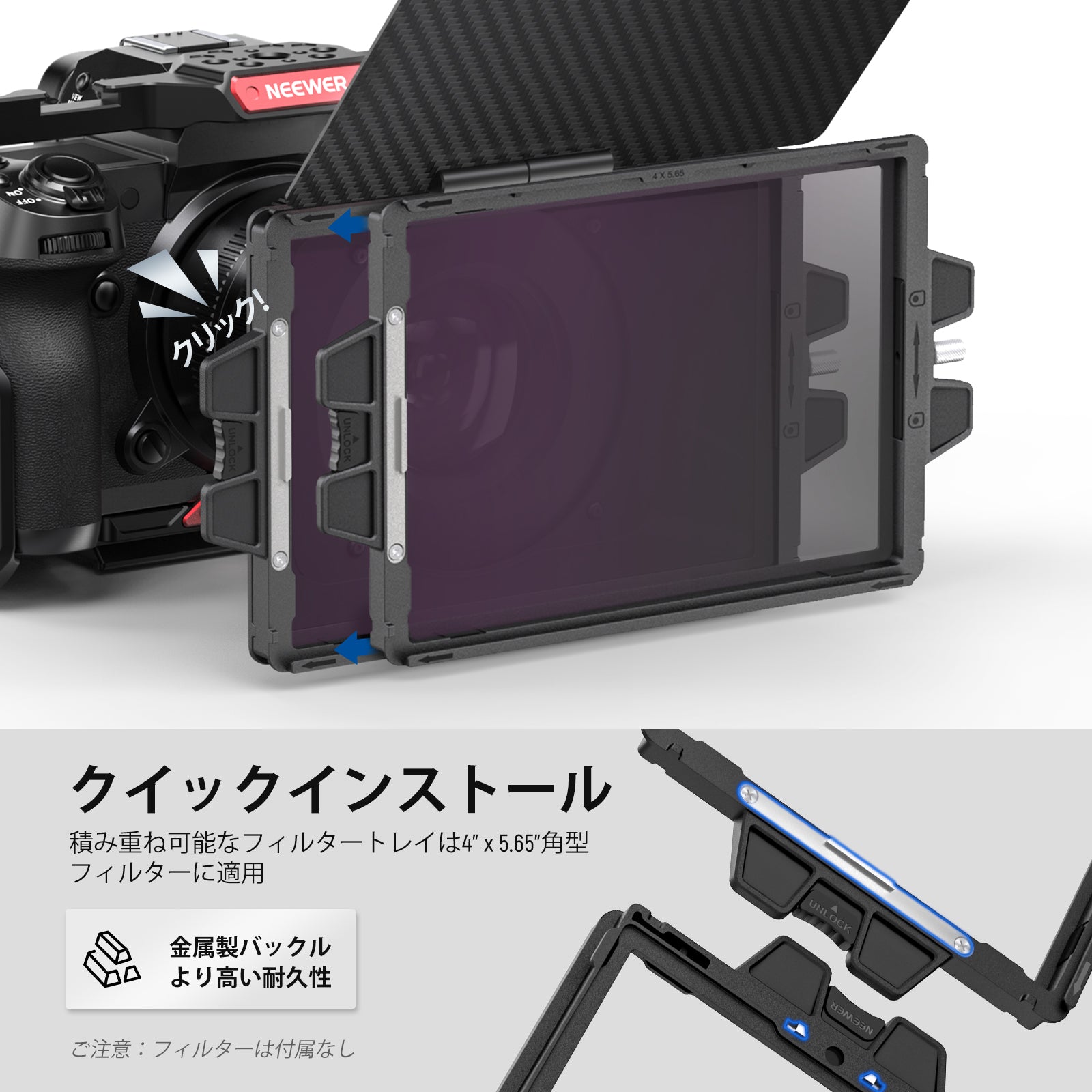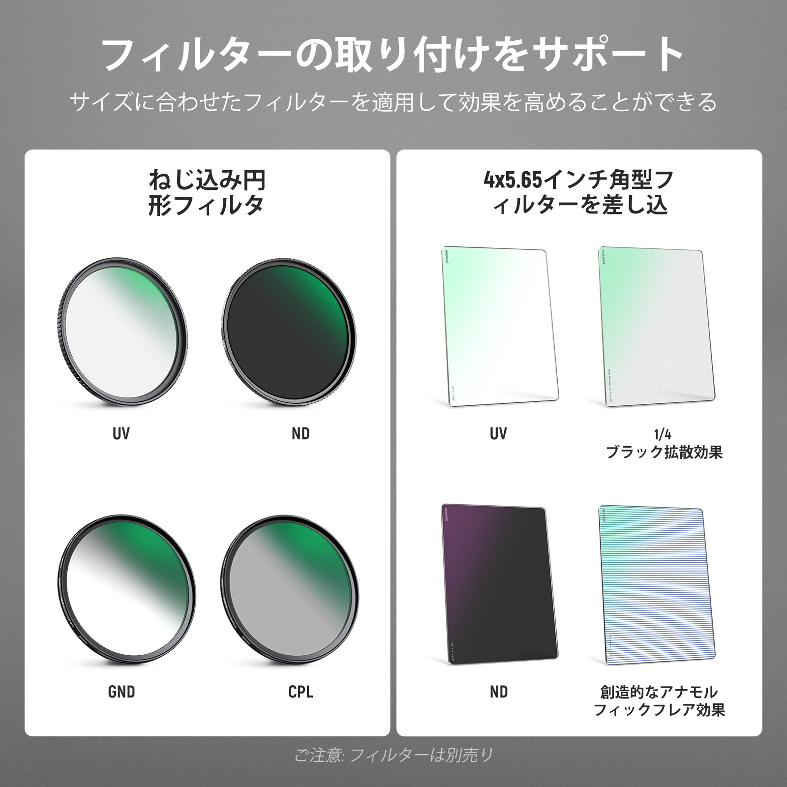【2つの積み重ね可能なフィルタートレイ】2つのフィルタートレイは、4"x5.65"の角型長方形フィルター (含まれていおりせん) に適合します。これらのフィルター トレイを下部のスロットにスライドさせてすばやく積み重ねるか、リリースクイックボタンを押して取り外します。フィルター(別売り)は、フィルタートレイのネジノブで固定し、ゴムパッドで保護できます。K&F NISI TIFFEN角型フィルターに対応します。