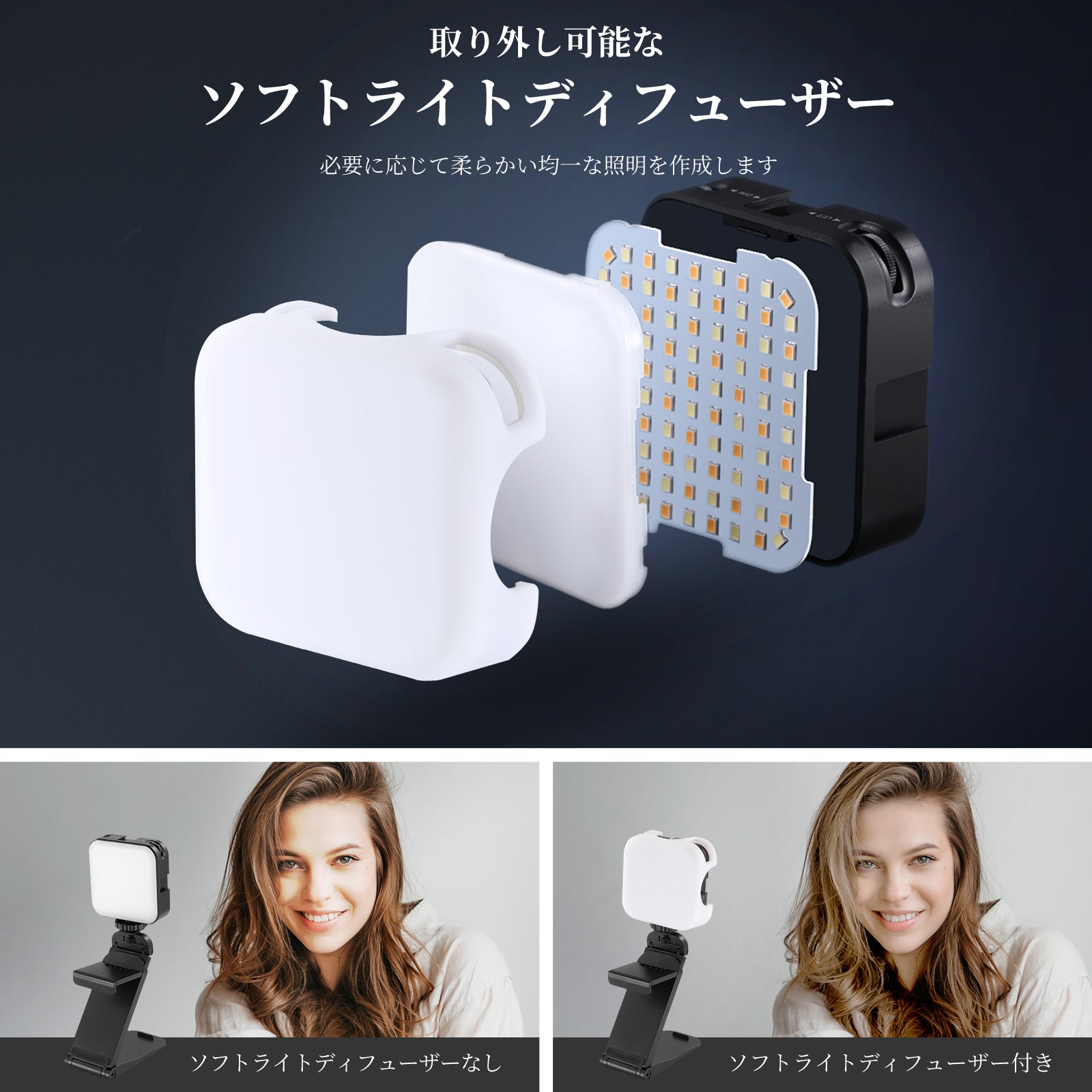 【ワイドで柔らかな光彩】2900K~7000Kの広範な色温度範囲により、クールなブルートーンから温かみのあるキャンドルライトの色合いまで、あらゆる照明シナリオに合わせた2色の照明が得られます。付属の取り外し可能なシリコンソフトディフューザーは、均一な配光を保証し、強い影を排除し、顔に完璧な輝きをもたらします。