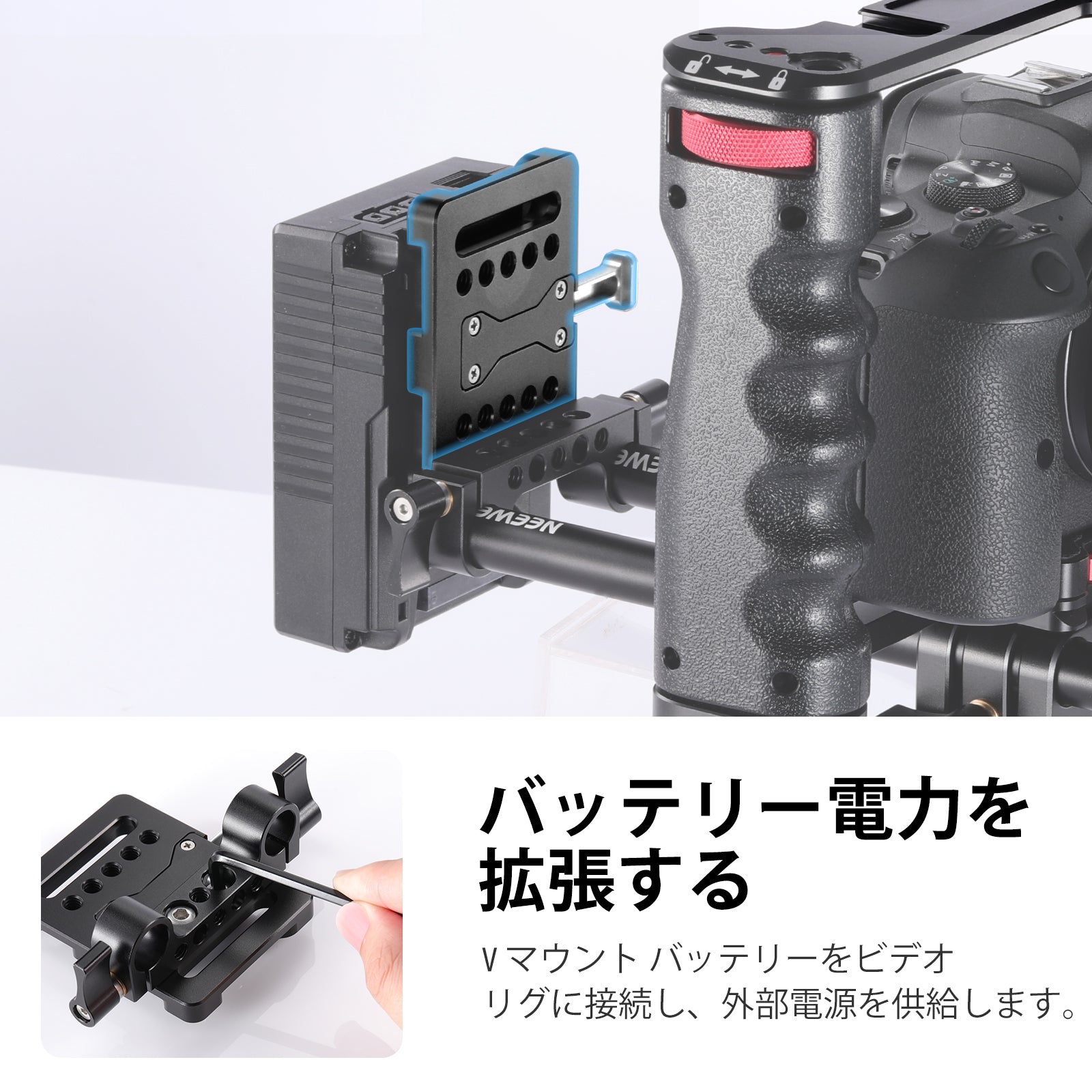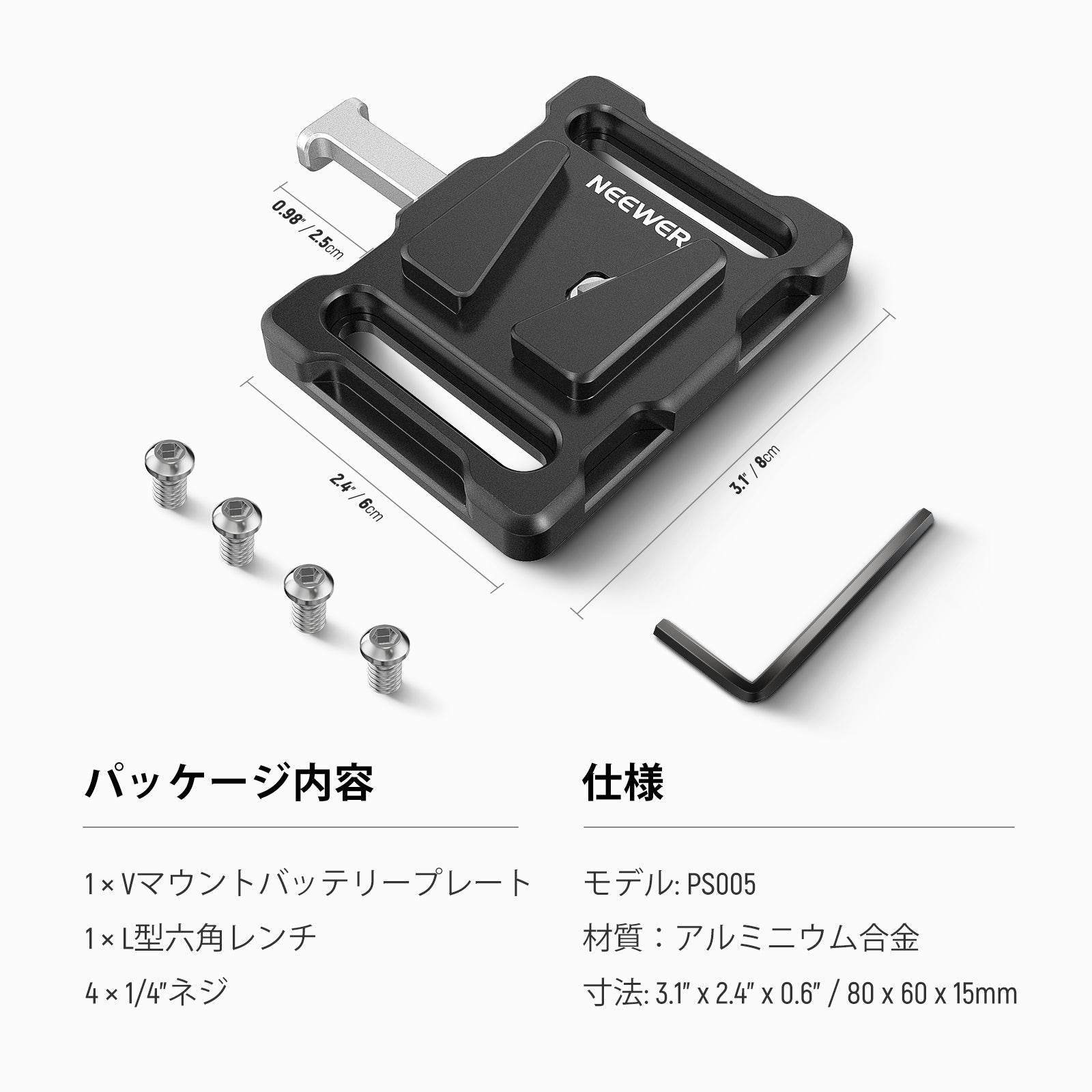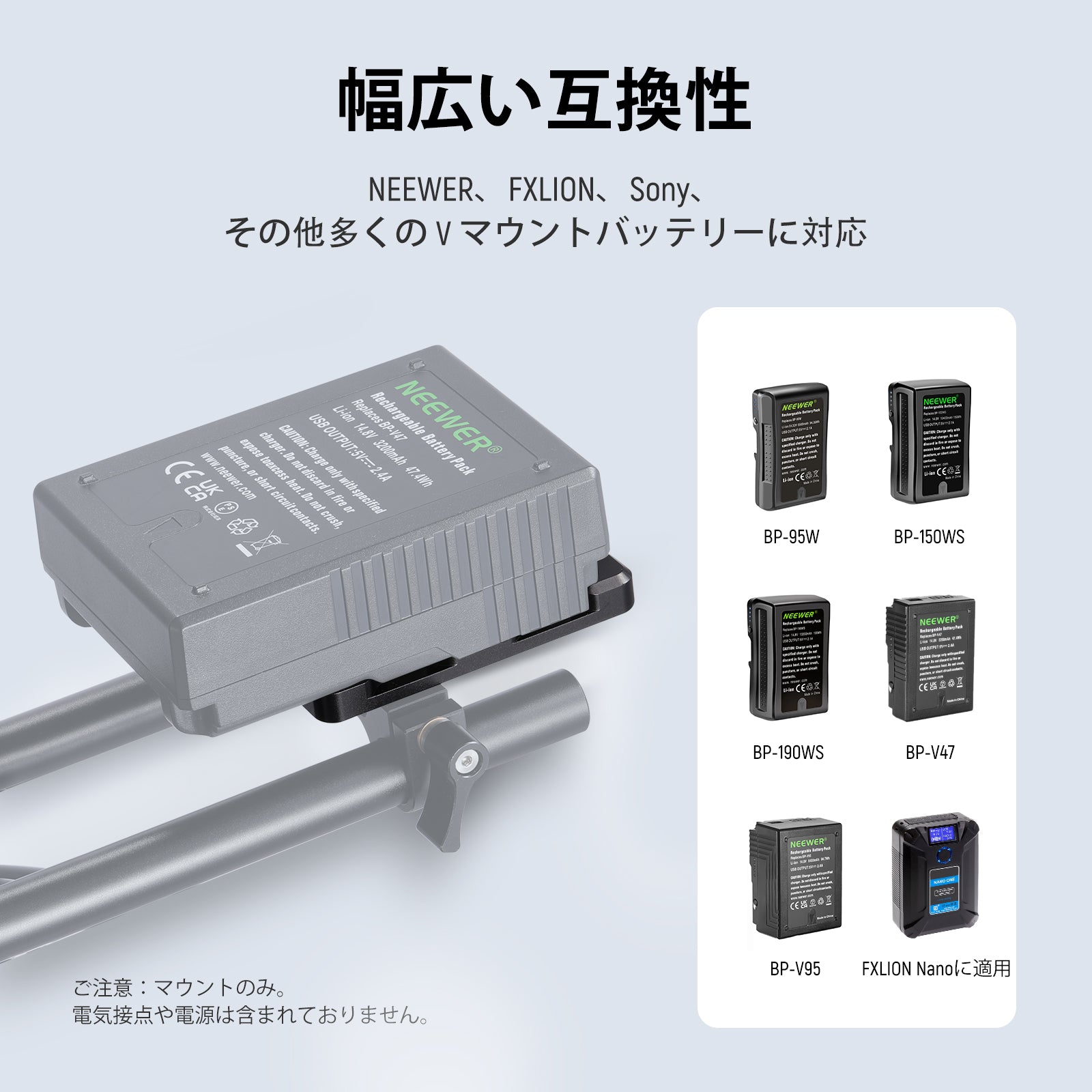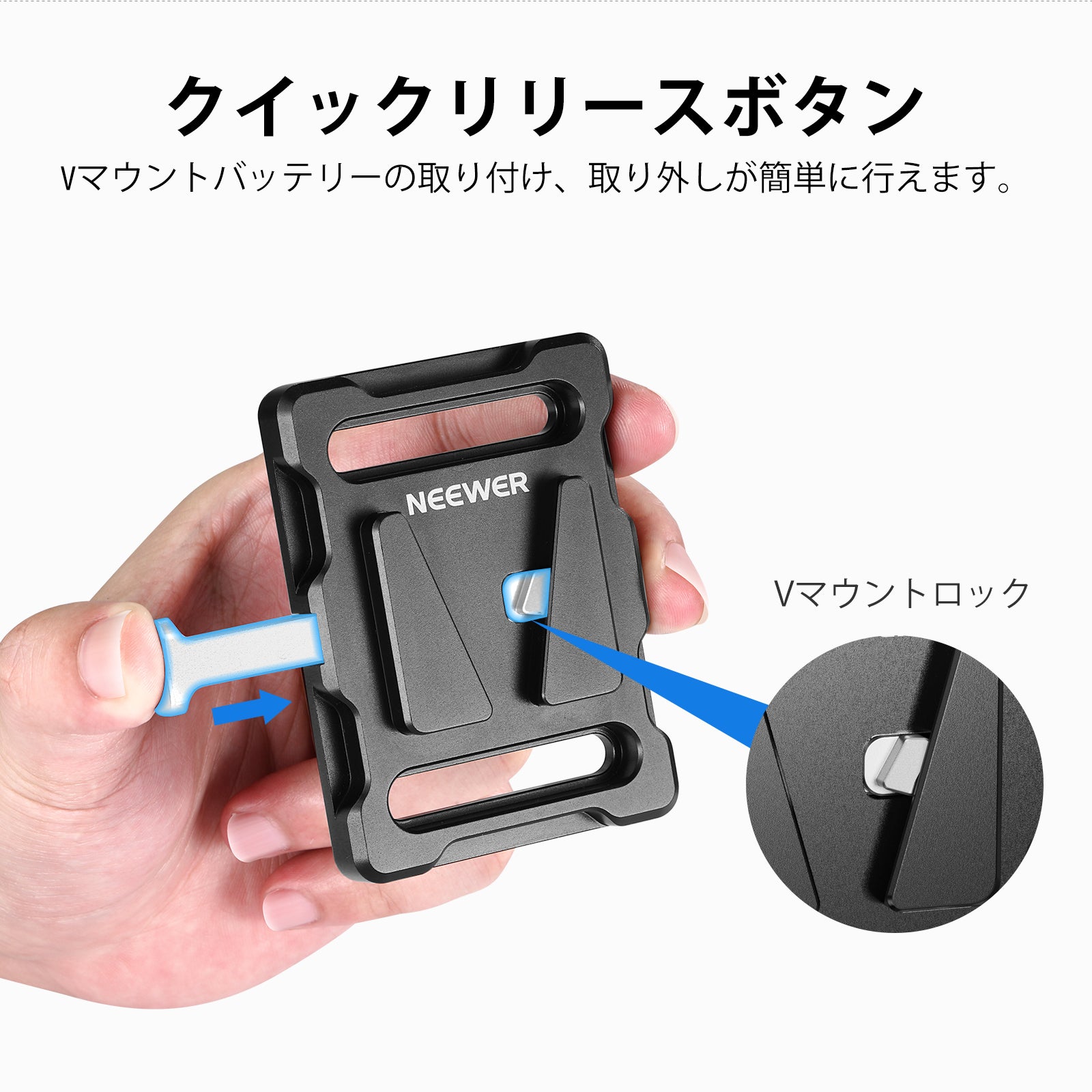 【ミニVマウントバッテリープレート】PS005 ユニバーサルVロックバッテリープレートは、NEEWER PS099E BP-95W BP-150WS BP-190WS BP-V47 BP-V95 Vロックバッテリーで動作し、その他のほとんどのVマウントバッテリーにも対応します。DSLR/ミラーレスカメラ、ビデオカメラ、モニターの外部電源として機能します。クイックリリースボタンも付いており、バッテリーの取り付けと取り外しが瞬時に行えます。