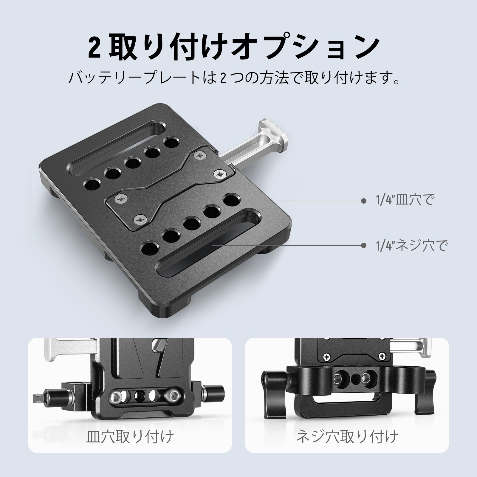 【複数の取り付けポイント】2x1/4"皿穴と10x1/4"ネジ穴により、チーズプレートやカメラ ケージなどの様々なアクセサリーの異なる位置にバッテリープレートを取り付けることができます。付属の1/4"ネジで15mmロッドクランプ(別売り)に取り付け、15mmロッドレールシステムでショルダーリグにマウントすることもできます。SmallRig ケージ、Tilta リグ、NICEYRIG カメラリグおよびロッドに対応しています。