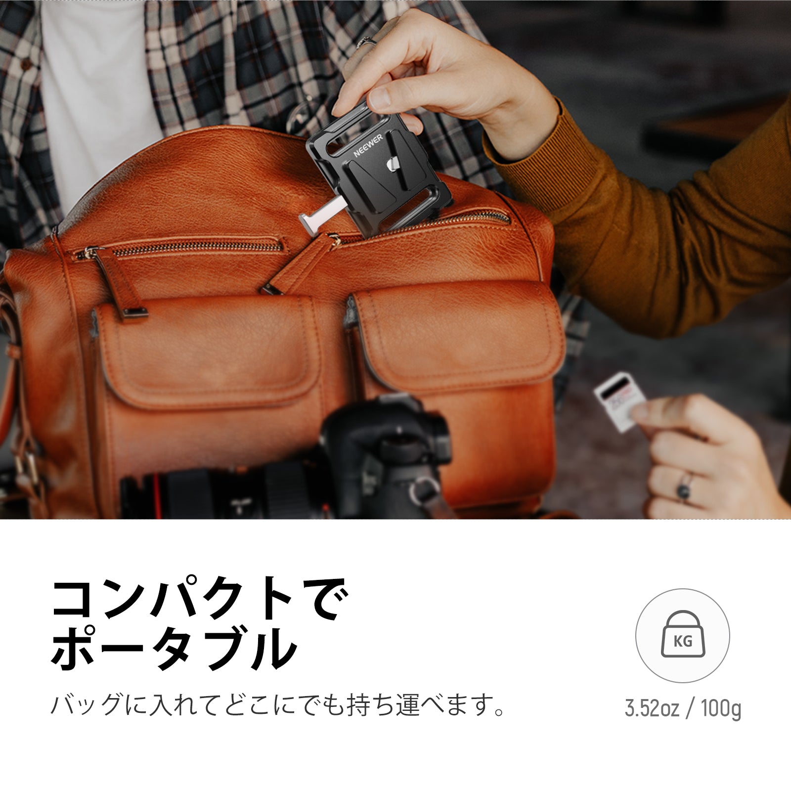 【コンパクト&ポータブル】バッテリープレートをカメラバッグにスライドさせて、どこにでも持ち運べます。軽量でサイズが小さいので負担になりません。