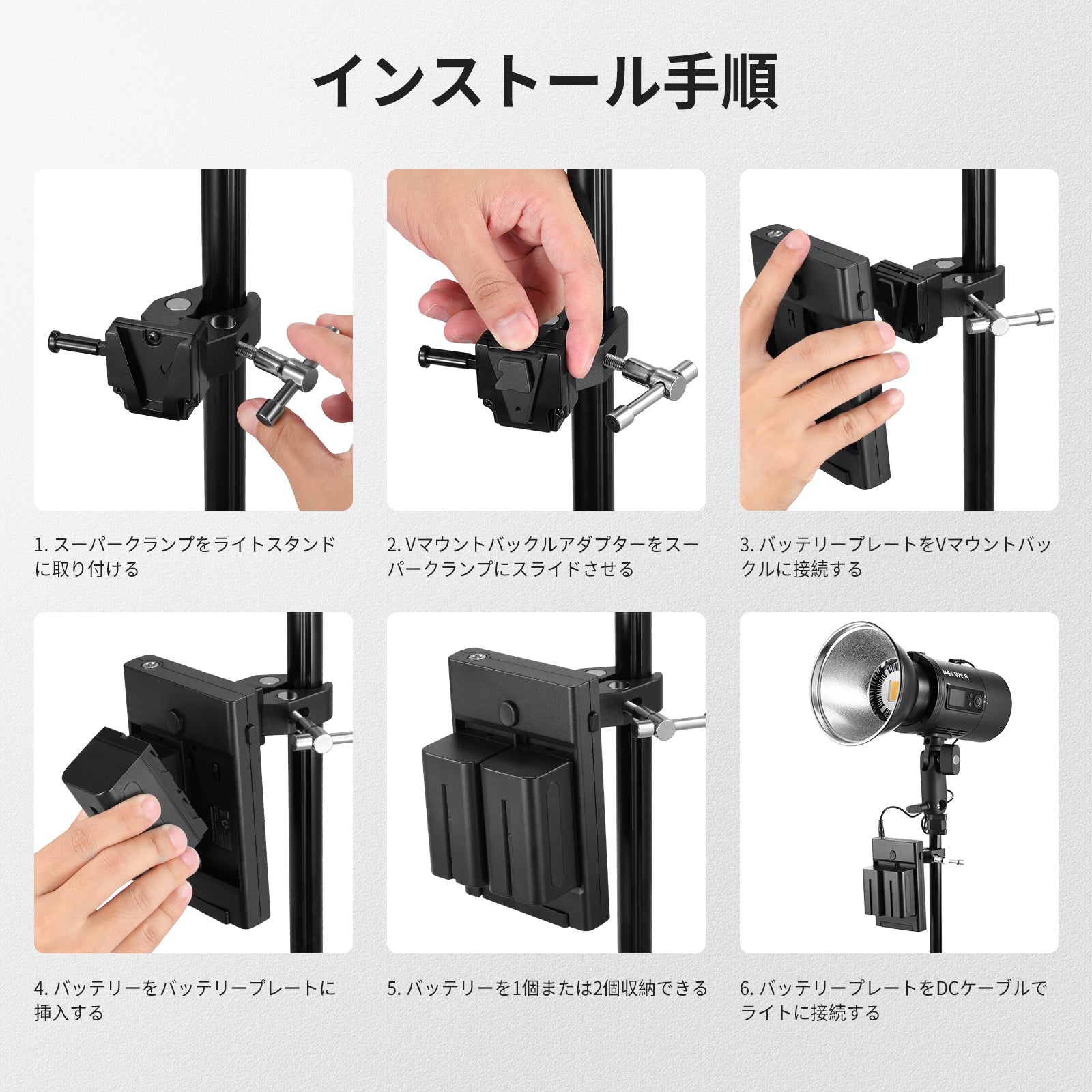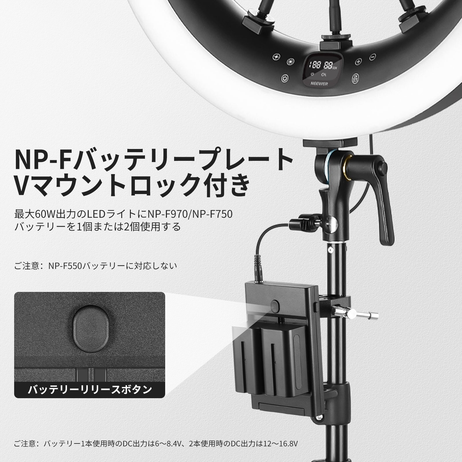 【便利なDC電源】5.5x2.5mmメスコネクター2個付き5フィート(1.5m)DCケーブルも含まれています。電池プレートをスタジオLEDビデオライトに接続して電源を供給し、ライトをどこにでも移動できます。コンパチブル Aputure AL-M9、コンパチブル Godox SL-60W、コンパチブル ZHIYUN Molus G60 60W Pocket COB Light、コンパチブル NEEWER 18インチリングライト MS60B MS60C 660 RGB660など。