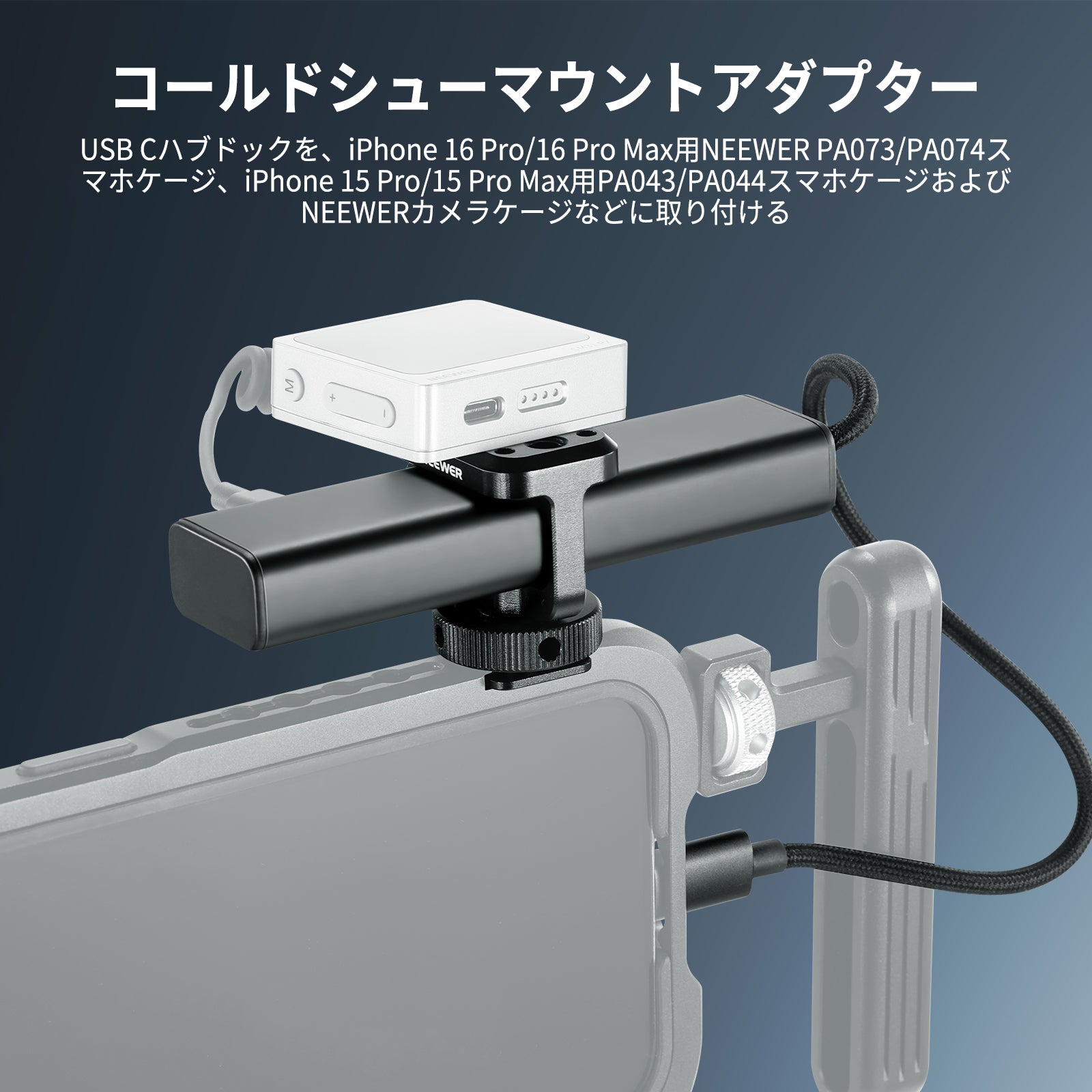 【コールドシューマウントアダプター】USB Cハブドックを、スマホケージやカメラケージに取り付けることができます。iPhone 16 Pro/16 Pro Max用NEEWER PA073/PA074スマホケージ、iPhone 15 Pro/15 Pro Max用PA043/PA044スマホケージおよび他のNEEWERカメラケージなどに対応します。コンパチブル SmallRigスマホケージやカメラケージ。