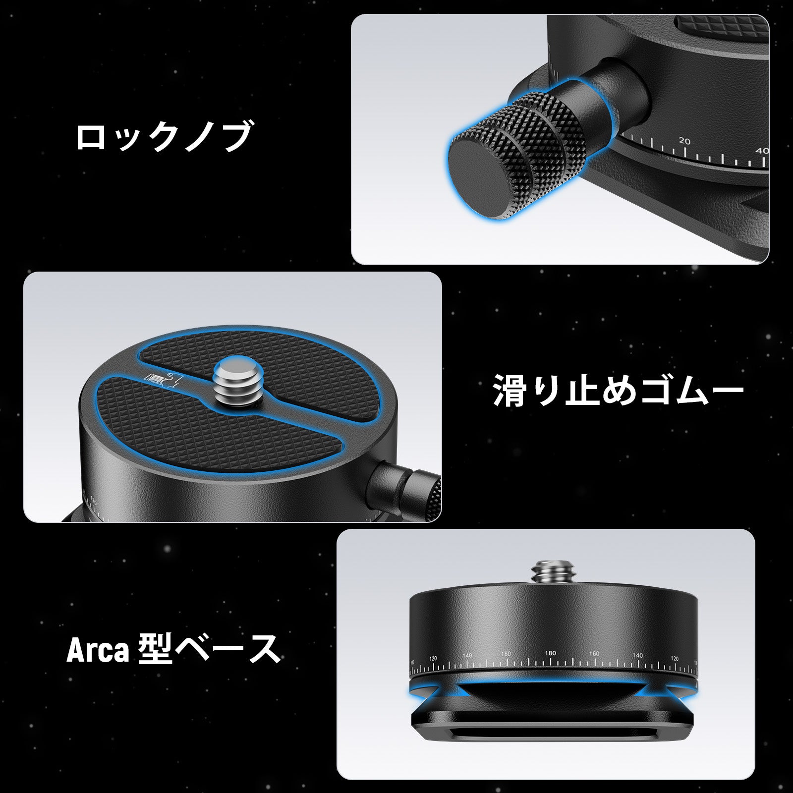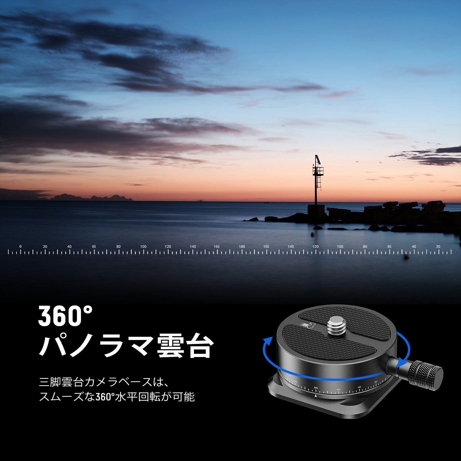 - 【360°パノラマ雲台】三脚雲台のカメラベースは水平方向に360°スムーズに回転し、素晴らしいパノラマ写真を簡単に撮影するのに最適です。ロックノブにより使用中の安定性が向上します。