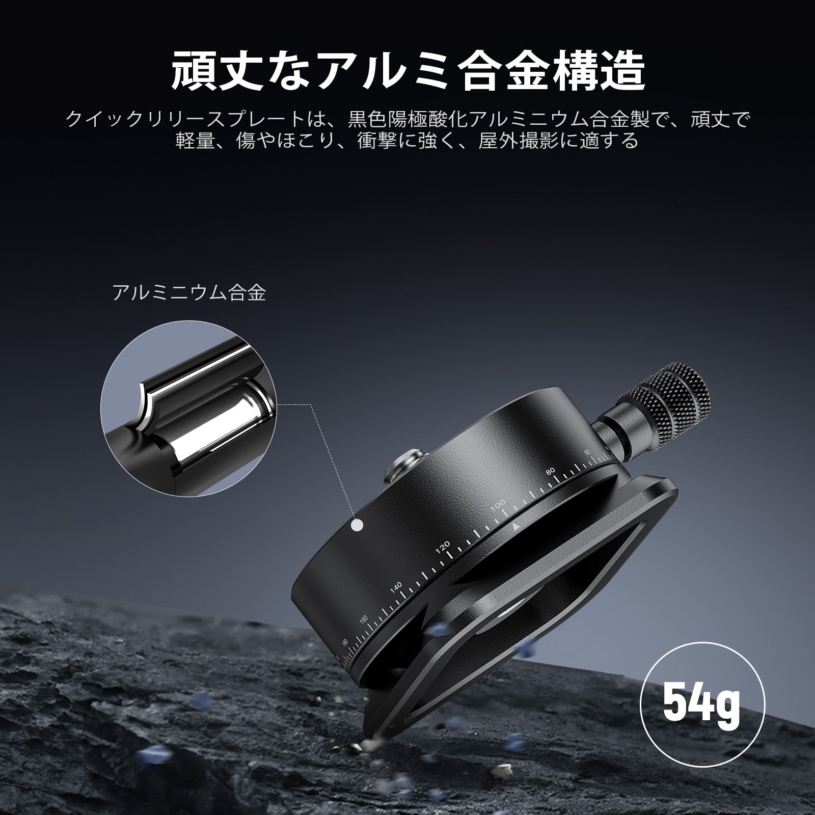 【頑丈なアルミ合金製】クイックリリースプレートは 、黒色陽極酸化アルミ合金製で、頑丈と軽量、傷、ほこり、衝撃に優れ、屋外撮影に適しています。最大荷重は5kg。