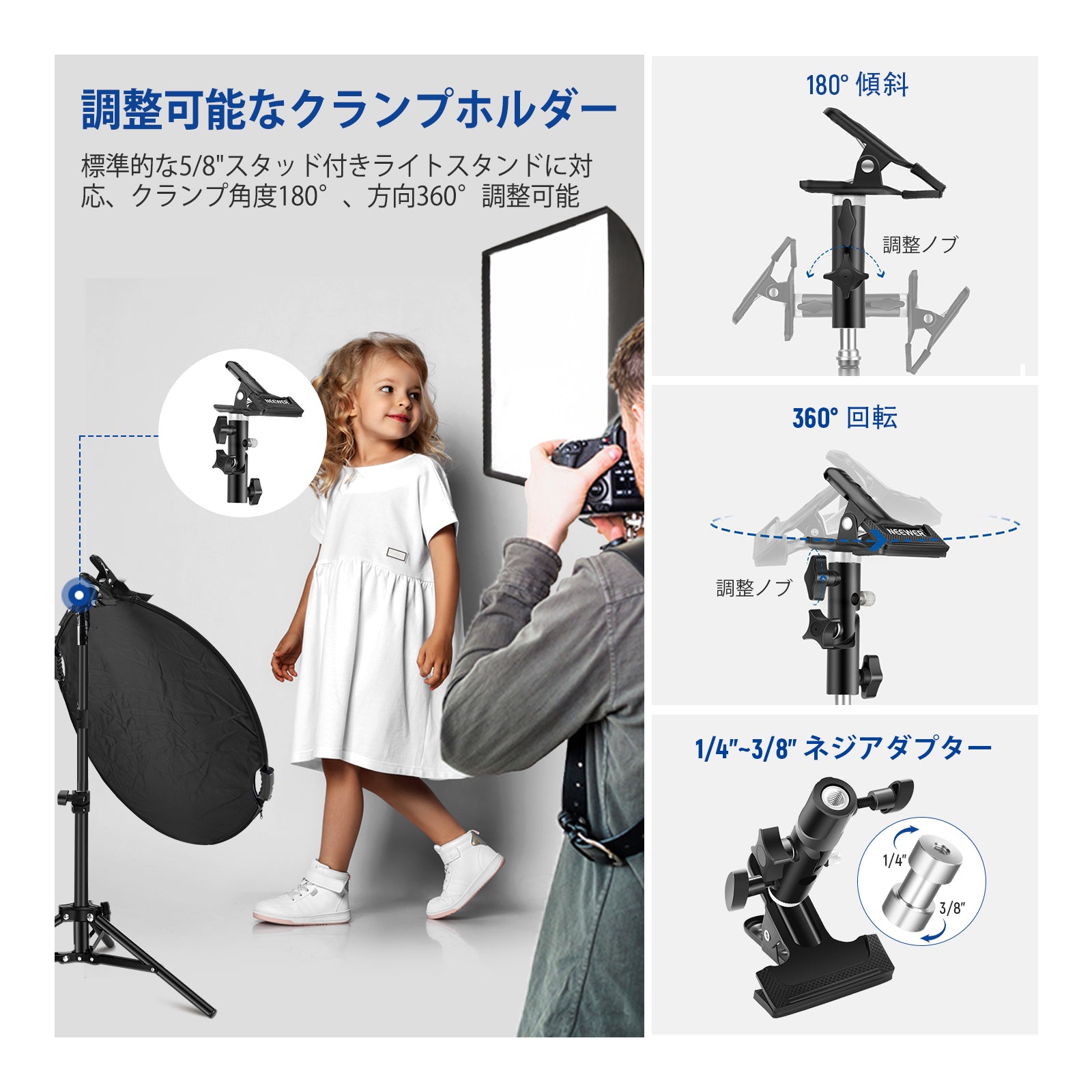 【調節可能なクランプホルダー】頑丈な金属製クランプホルダーをスタジオレフ板を保持できます。クランプは180°角度と360°方向に調節可能なので、レフ板を自由にお好みの角度に調節して、完璧な照明効果を実現できます。
