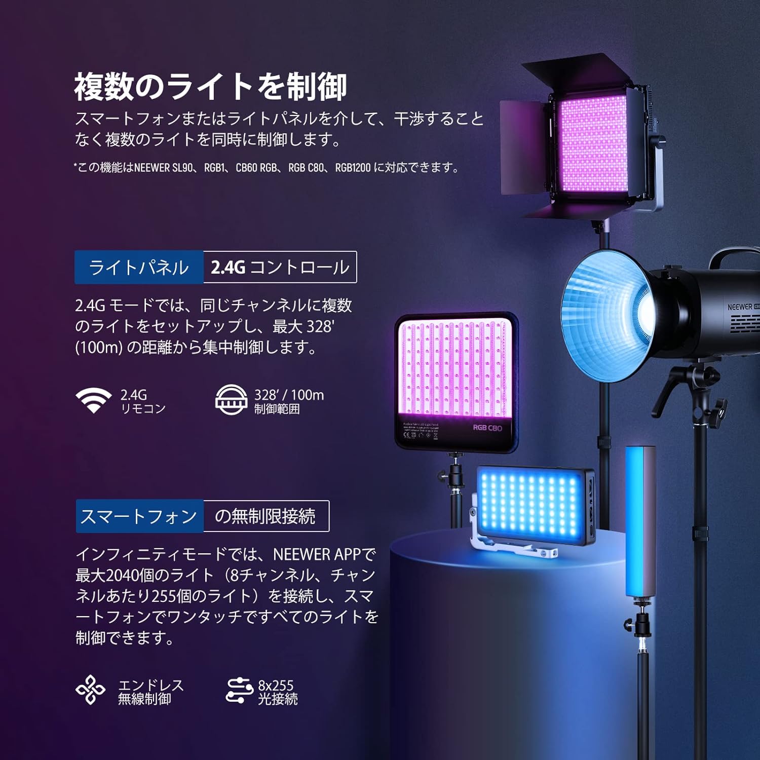 - 【Infinityアプリ制御&内蔵2.4G】Infinity 接続技術で構成されたNEEWER アプリを支持、最大 66'/20m まで、最大8 グループでマルチライト設定を動的に同時に調整し、アプリで最大255 台のデバイスを同時に制御できます。NEEWER SL90、RGB1、RGB C80、CB60 RGBなどのライトには2.4Gシステムと99チャンネルが組み込まれており、それらを同じチャンネルに設定し、ネットワークなしリモコンだけで100m以内のライトを制御できます。