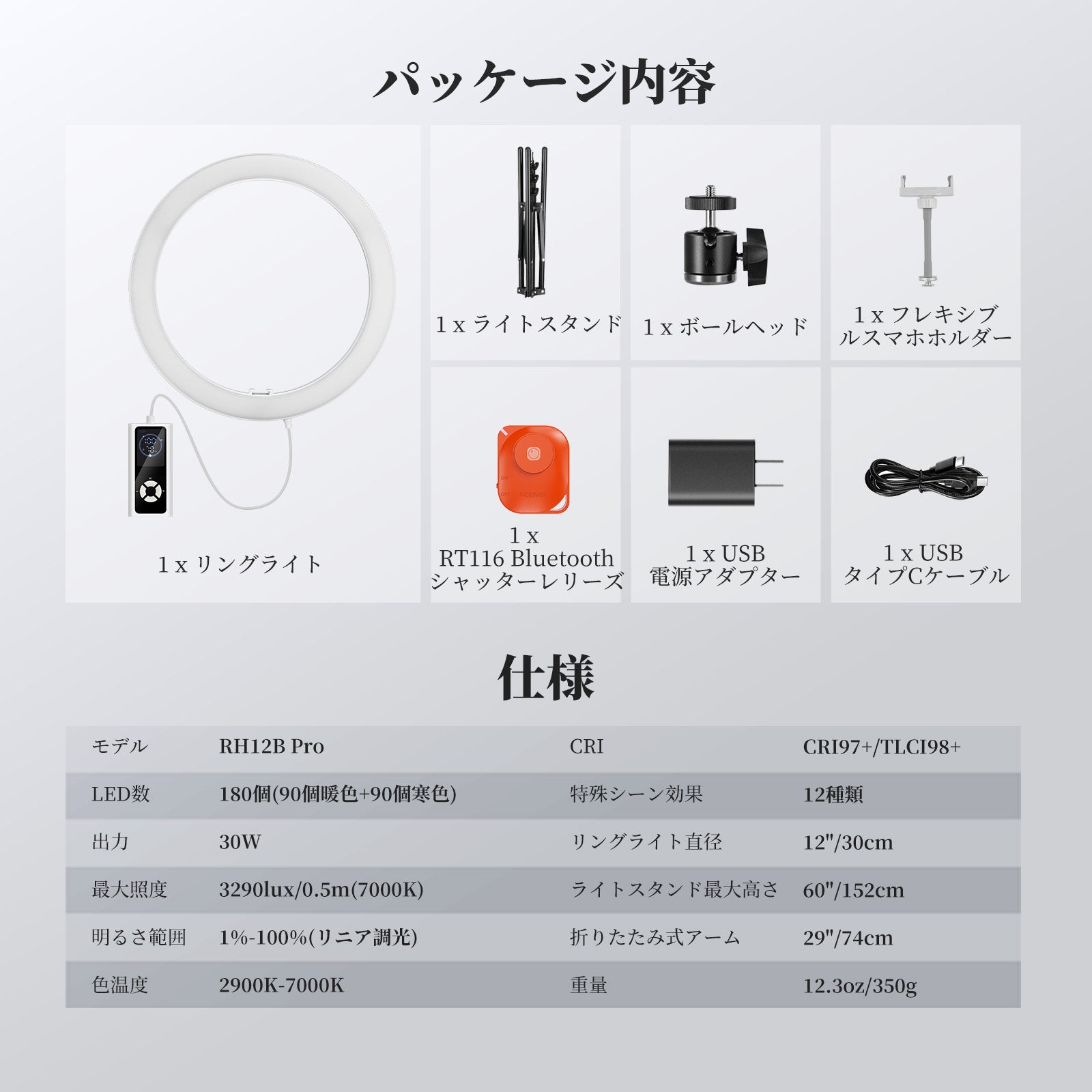 - 【プロ級補助光&30W高出力】RH12B ProリングライトはRH12Bのアップグレード版で、出力30W、180個の高品質LED(冷白/暖白各90)を搭載、0.5m距離で最大3290ルクス(7000K)の明るい連続照明を実現します。白い拡散カバーにより、柔らかく滑らかで均一な照明を実現します。エステティシャン、まつげエクステ、タトゥー、理容師、自撮り、メイク、TikTok/YouTube動画撮影、Zoom会議、Vlog収録、ライブ配信などに最適。